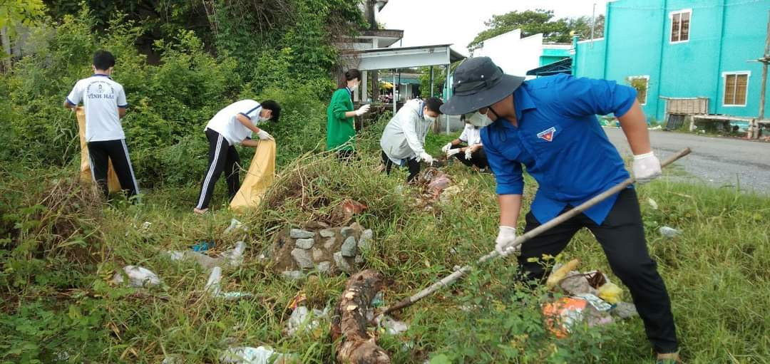 | Đoàn viên, thanh niên Sóc Trăng làm sạch rác thải ven đường giao thông nông thôn. Ảnh: PV. |