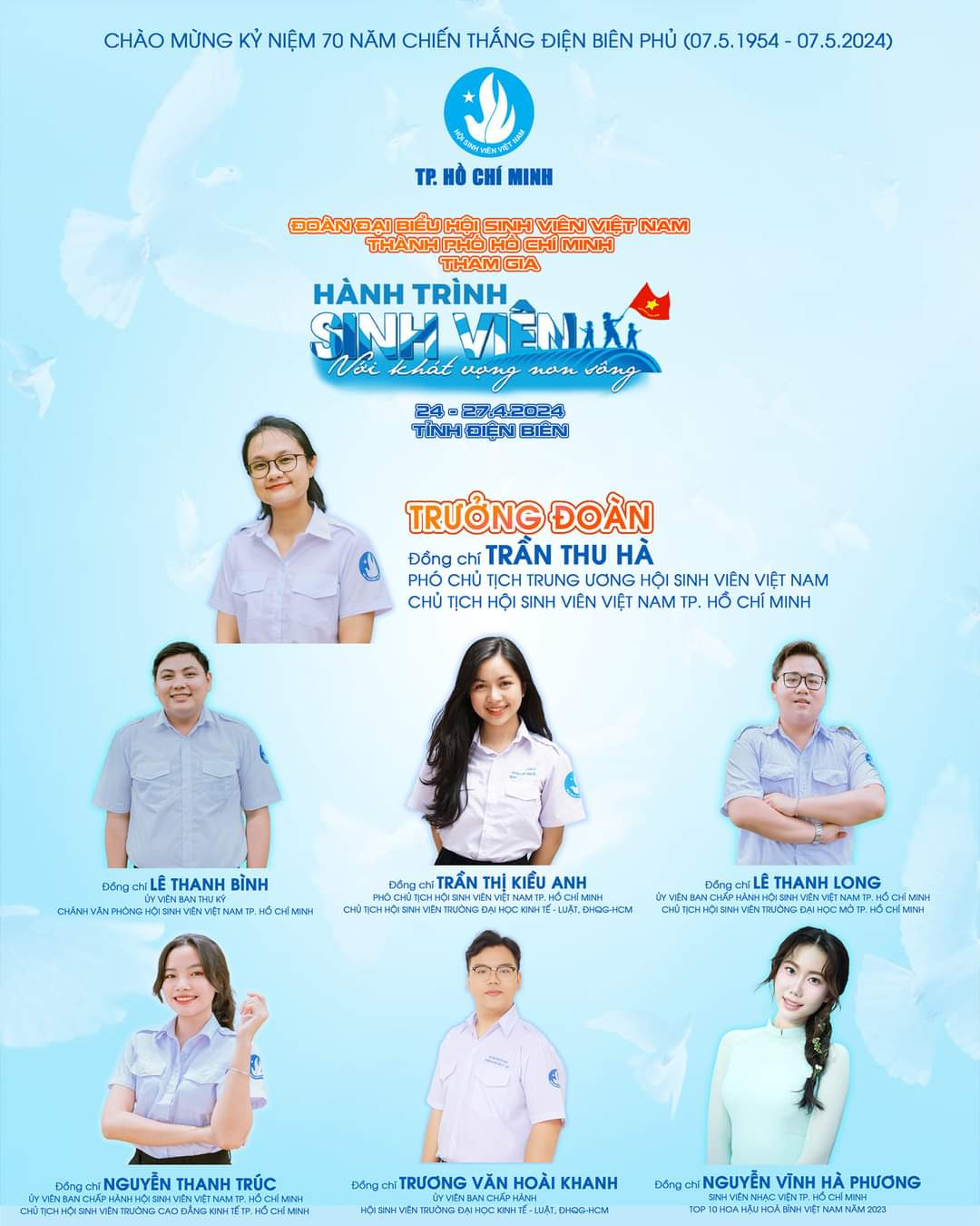 Hành trình 'Sinh viên với khát vọng non sông' do T.Ư Hội Sinh viên Việt Nam tổ chức. Hành trình diễn ra tại tỉnh Điện Biên từ ngày 24/4 đến ngày 27/4/2024, với sự tham gia của 70 đại biểu là cán bộ Hội, sinh viên tiêu biểu cả nước.