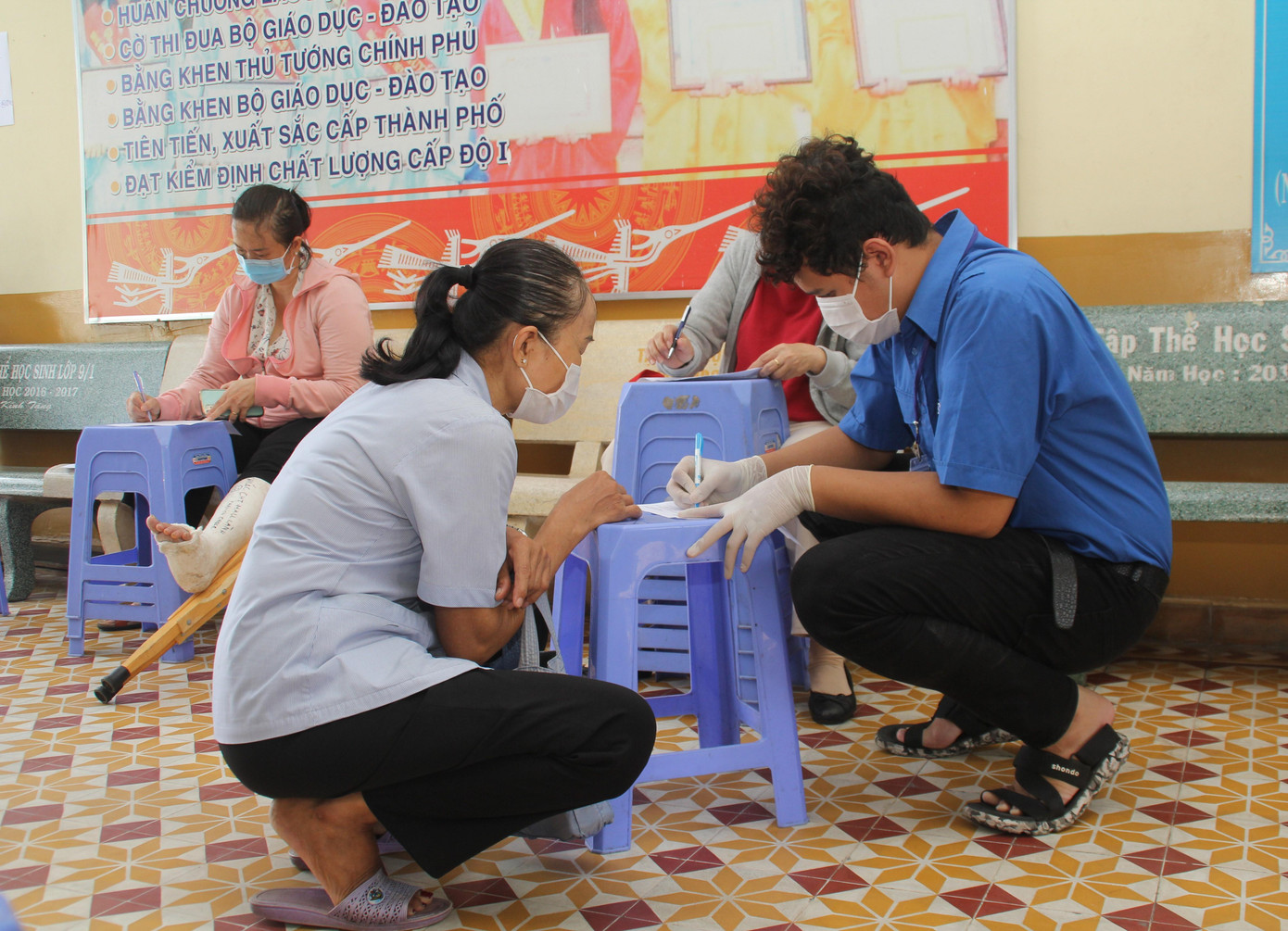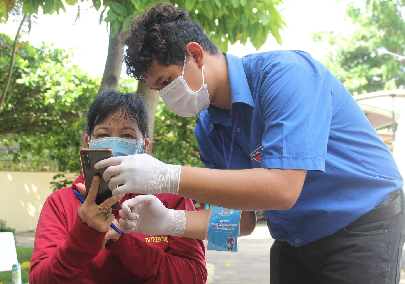 | Như Ý hỗ trợ người lớn tuổi khai báo y tế trước khi kiểm tra sức khỏe để tiêm vắc xin |