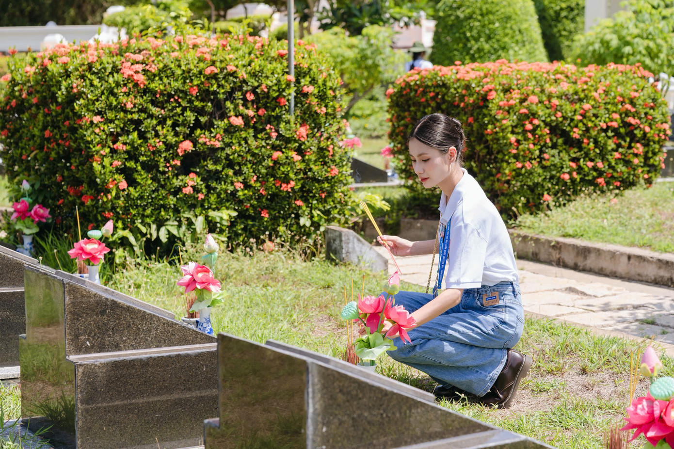 | 'Thanh niên tiên tiến làm theo lời Bác' thắp nhang các phần mộ liệt sĩ. |