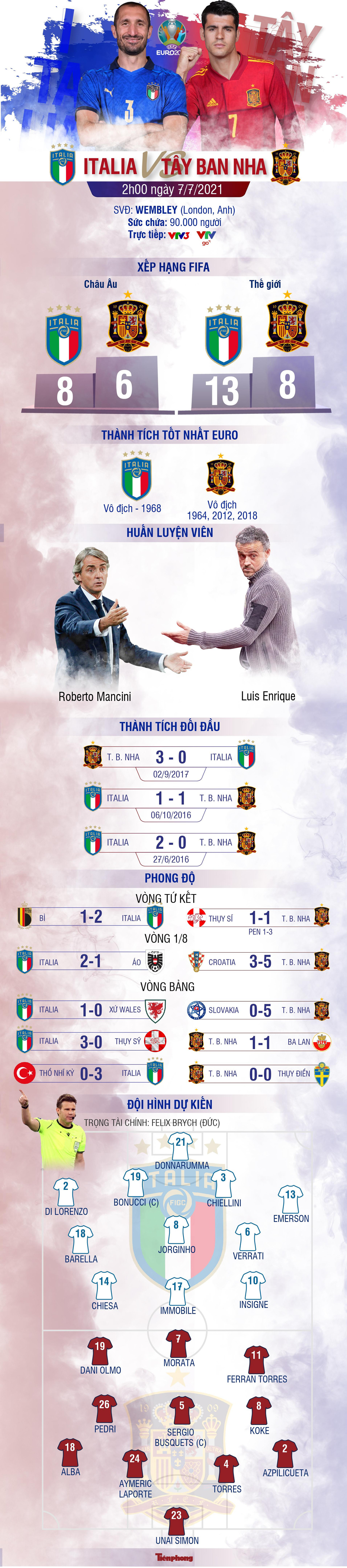 TPO - Italia - Tây Ban Nha là cặp đấu nhiều duyên nợ nhất trong lịch sử VCK EURO. Trận đấu diễn ra lúc 02h00 ngày 7/7 trên sân Wembley (London, Anh).