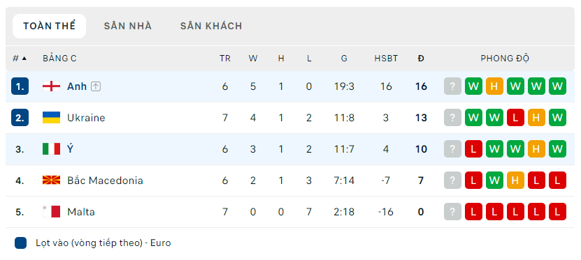 Bảng xếp hạng bảng C vòng loại EURO 2024