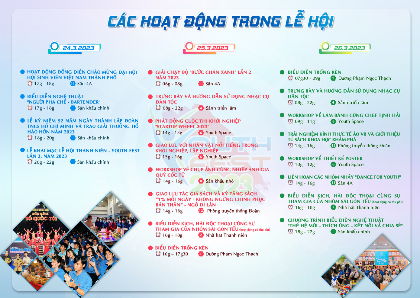 Trong khuôn khổ lễ hội còn diễn ra nhiều hoạt động hấp dẫn như biểu diễn nghệ thuật "Người pha chế - Bartender", giải chạy bộ "Bước chân xanh" lần 2 năm 2023; giao lưu với nhân vật nổi tiếng trong khởi nghiệp, lập nghiệp; Workshop chụp ảnh cùng nhiếp ảnh gia Quỷ Cốc Tử; giao lưu và ký tặng sách tác giả sách Ngô Di Lân, tác phẩm "1% mỗi ngày – không ngừng chinh phục bản thân"; Workshop làm bánh cùng Chef Tịnh Hải; liên hoan các nhóm nhảy "Dance for Youth"; biểu diễn hài độc thoại; chương trình biểu diễn nghệ thuật "Thế hệ mới – Thích ứng – Kết nối và chia sẻ...