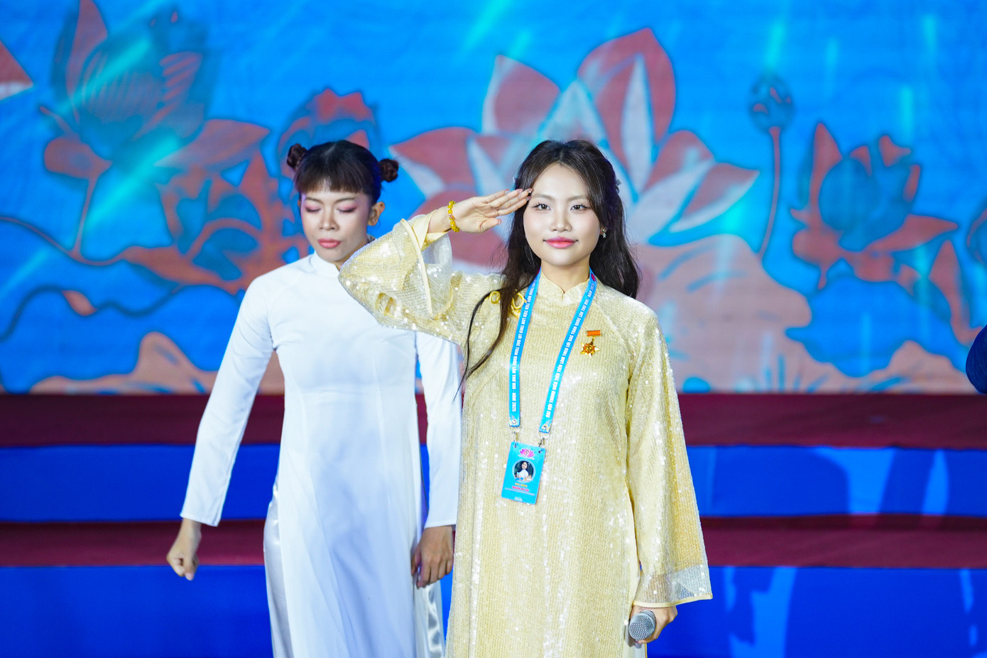 Vừa hoàn tất chuyến thiện nguyện hỗ trợ trẻ em vùng cao Tây Bắc, cô có mặt tại đại hội với áo dài truyền thống cùng huy hiệu “Thanh niên tiên tiến làm theo lời Bác”.