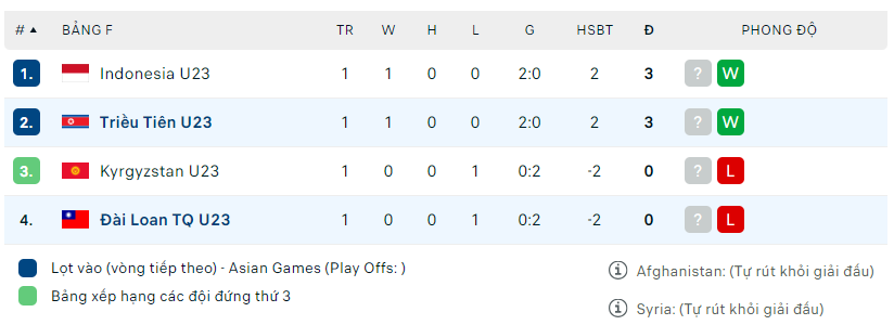 Chiến thắng này giúp Olympic Indonesia chia sẻ ngôi đầu bảng với Olympic Triều Tiên, đội đã thắng Olympic Đài Loan 2-0 trước đó. Các kết quả này giúp đội bóng của HLV Indra Sjafri sáng cửa đi tiếp. Ở trận tiếp theo, họ sẽ giành vé sớm nếu đánh bại Olympic Đài Loan.
