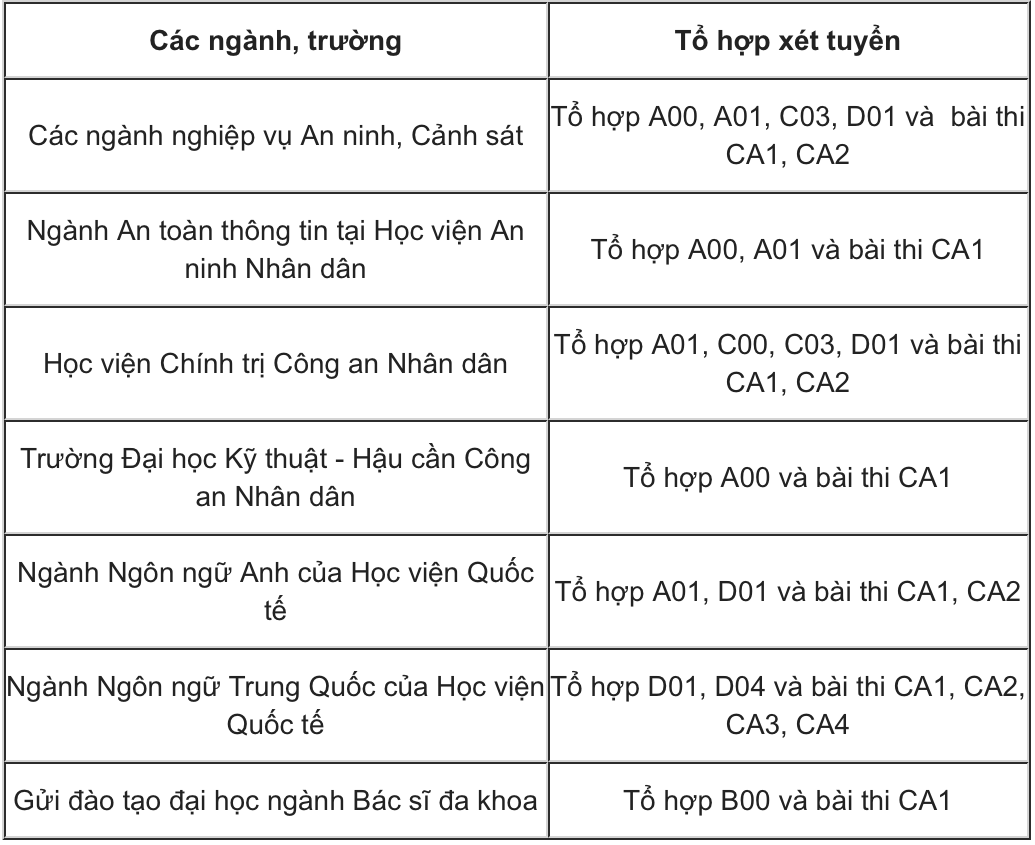- Trường hợp Bộ Công an không tổ chức thi bài thi Bộ Công an thì xét tuyển theo kết quả thi tốt nghiệp trung học phổ thông theo các tổ hợp (A00, A01, B00, C00, C03, D01, D04) kết hợp với kết quả học trung học phổ thông.