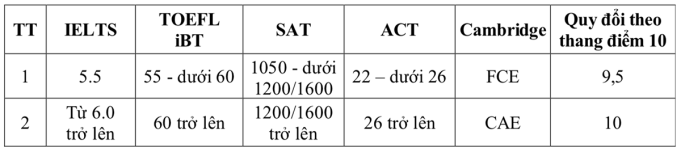 Ở phương thức kết hợp chứng chỉ tiếng Anh quốc tế với kết quả thi tốt nghiệp THPT, thí sinh phải có điểm thi hai bài Toán, Văn hoặc Toán, Lý hoặc Toán, Hóa từ 11 trở lên và có chứng chỉ IELTS tối thiểu 5.5, TOEFL iBT đạt 55, Cambridge FCE, SAT 1050/1600 hoặc ACT tối thiểu 22. Trong đó, chứng chỉ tiếng Anh quốc tế sẽ quy đổi sang thang điểm 10.