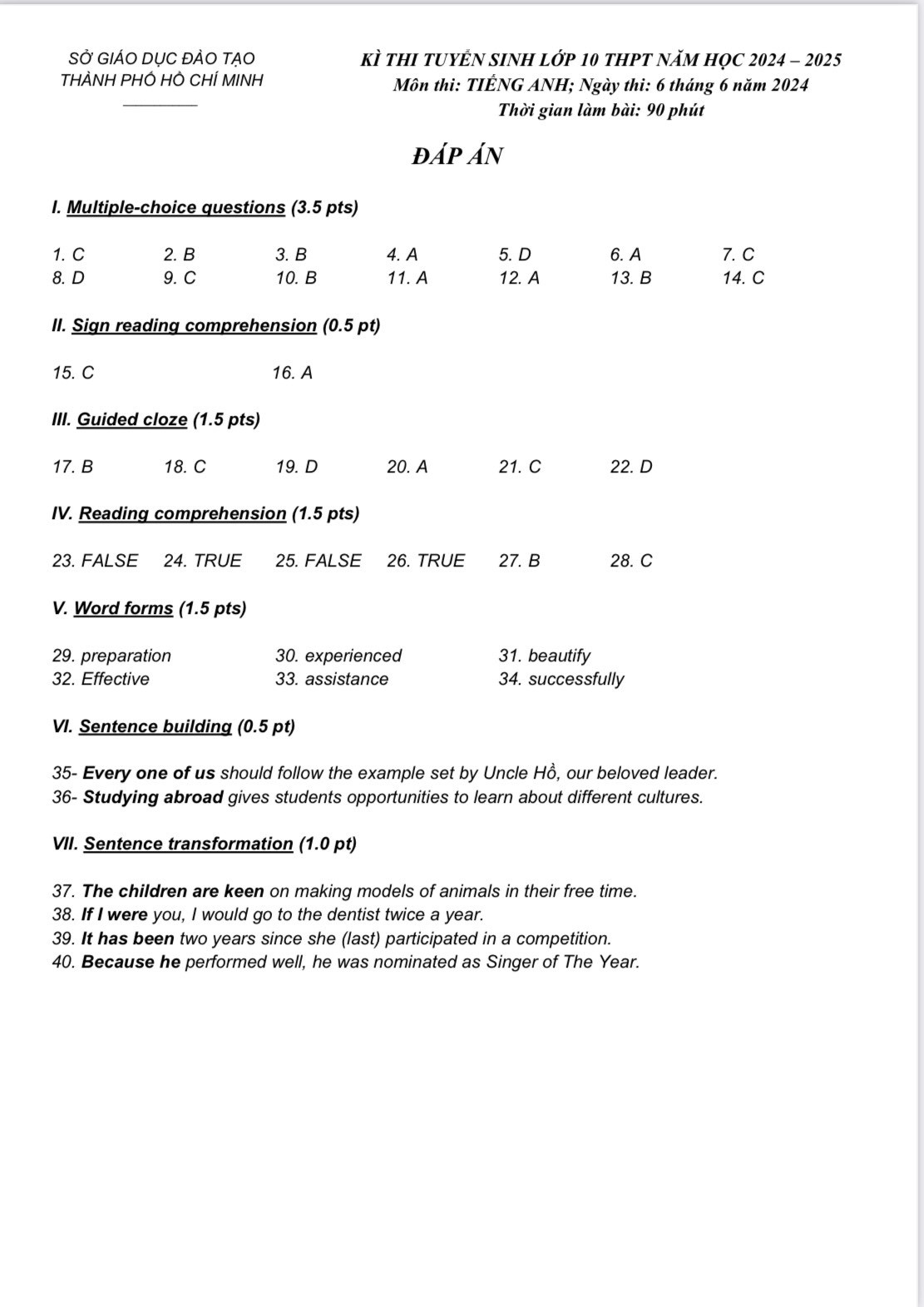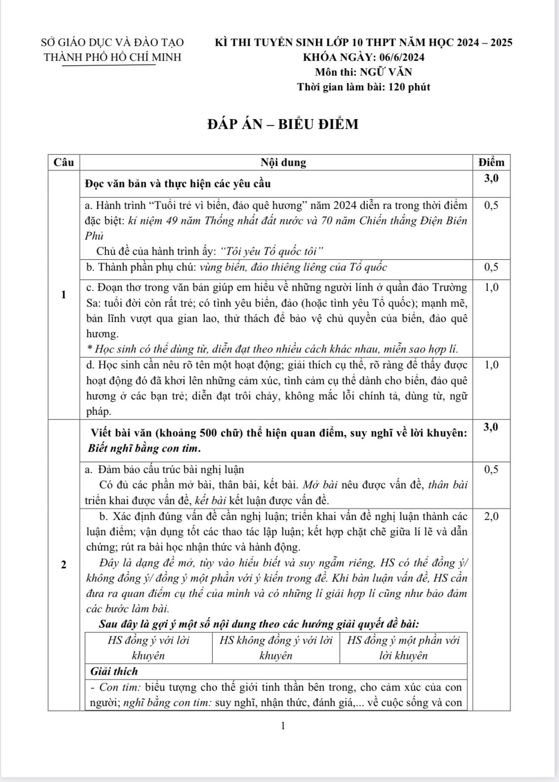 HHTO - Sở GD&ĐT TP.HCM vừa công bố đáp án chính thức của ba môn: Toán, Ngữ văn và Tiếng Anh của kỳ thi tuyển sinh vào lớp 10 năm 2024 trong hai ngày 6 - 7/6 vừa qua.