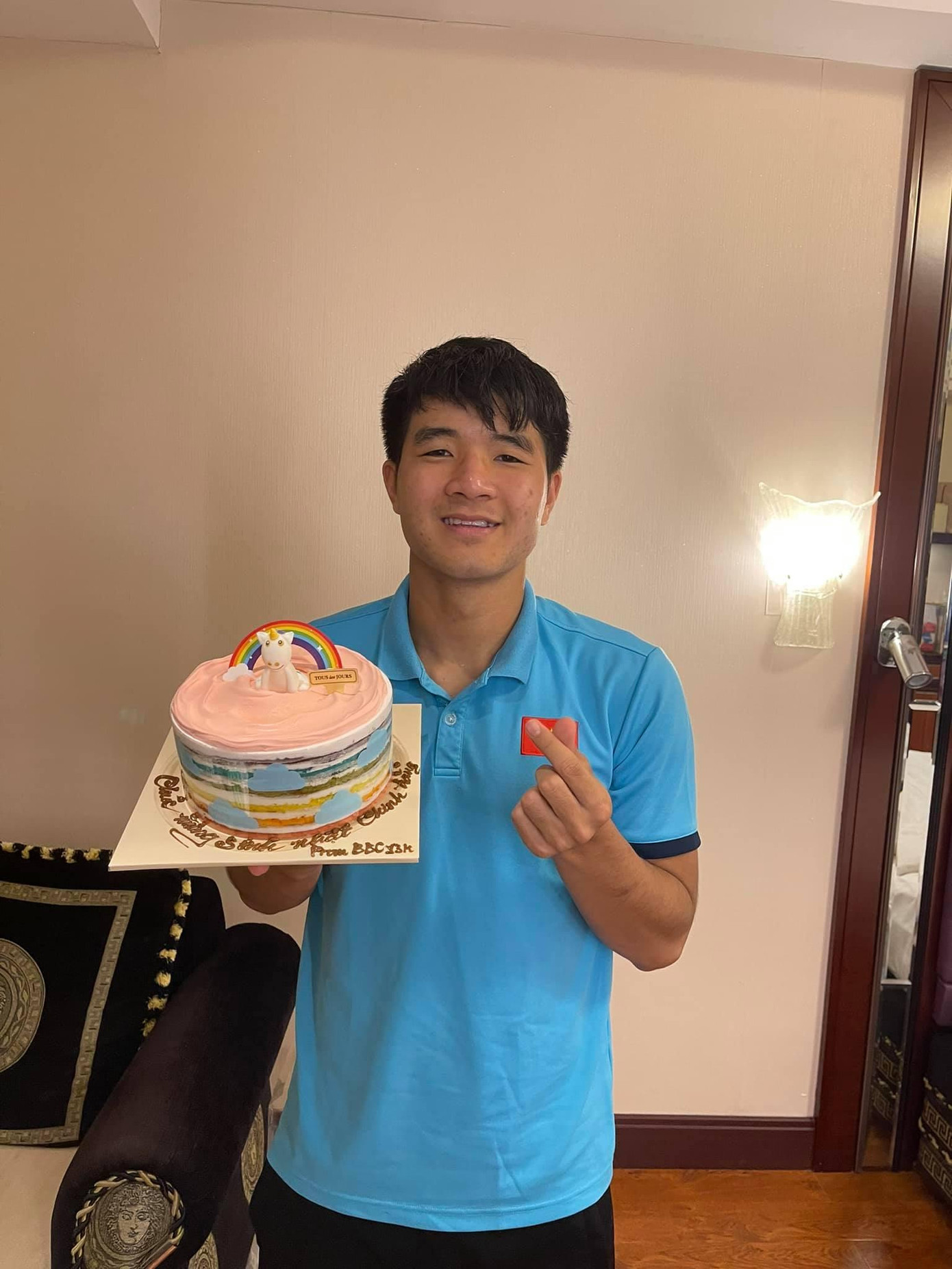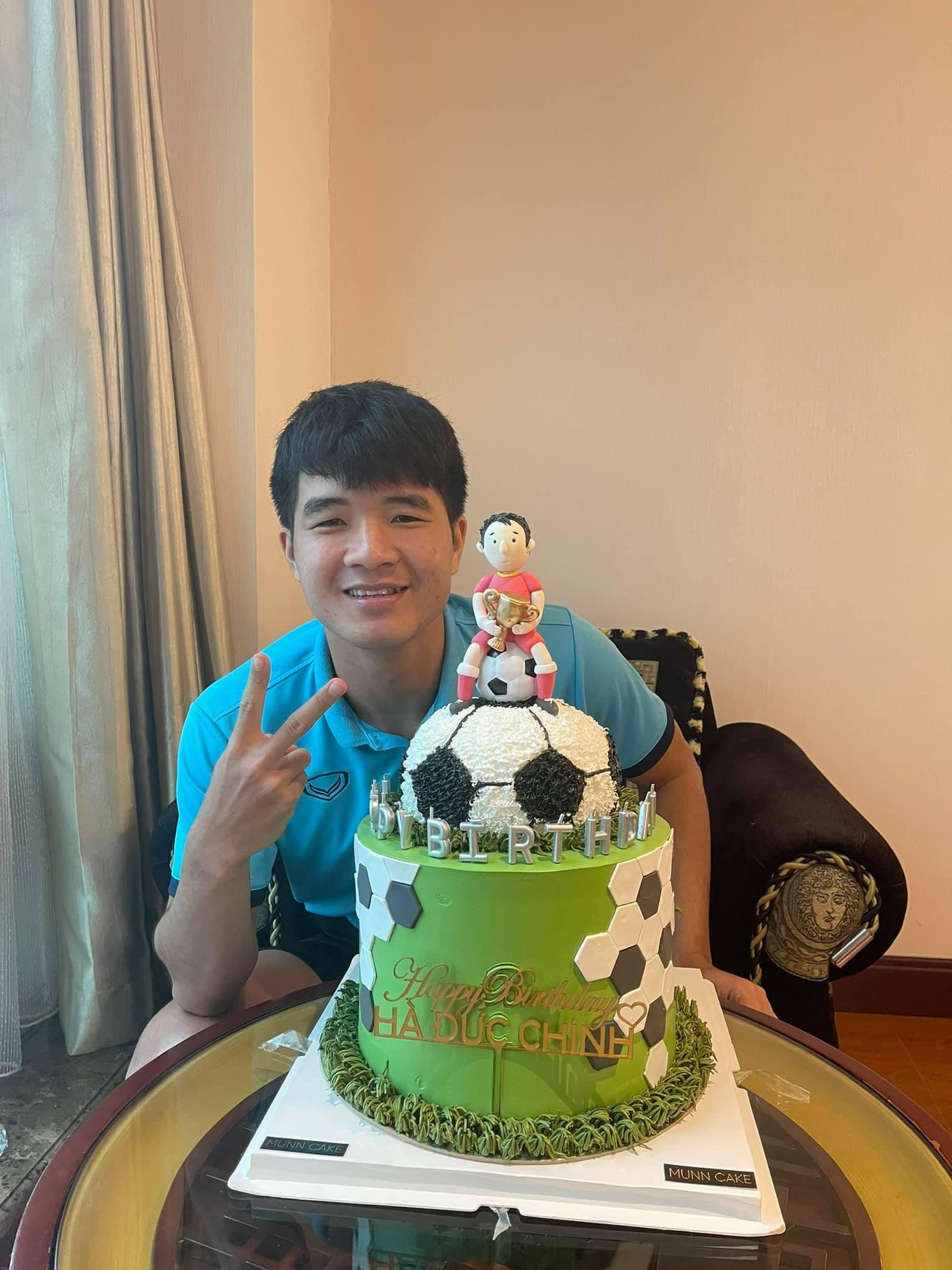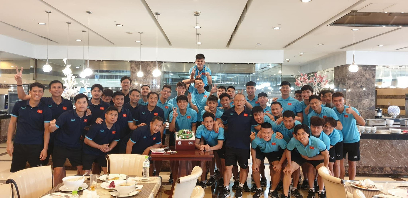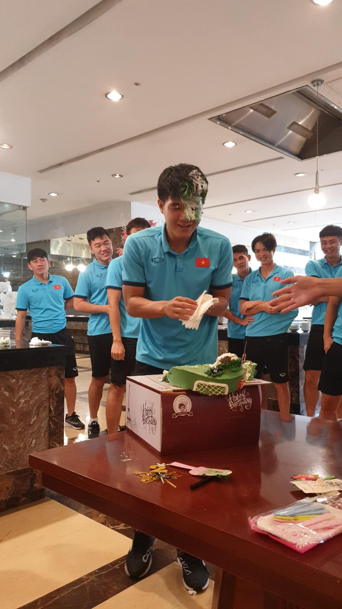 Còn tại khách sạn nơi đội tuyển đóng quân, Ban huấn luyện và các cầu thủ cũng đã tổ chức sinh nhật cho Đức Chinh và chụp hình lưu niệm.