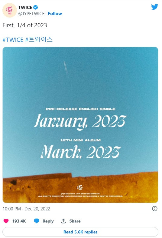 Mới đây, nhóm nhạc nữ đình đám nhà JYP - TWICE chia sẻ rằng nhóm chuẩn bị phát hành đĩa đơn tiếng Anh thứ hai của nhóm. Ca khúc này sẽ xuất kích ngay năm mới, cụ thể là trong tháng 1 năm 2023.