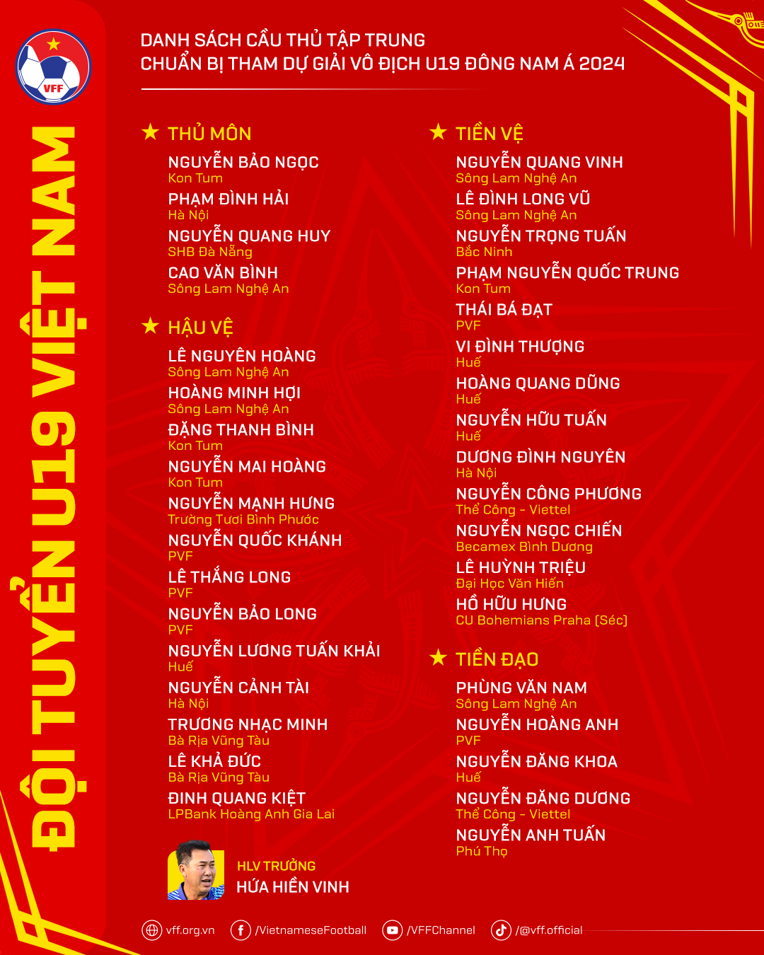 Hôm qua, HLV Hứa Hiền Vinh công bố danh sách 35 cầu thủ được triệu tập lên tuyển U19 Việt Nam chuẩn bị cho giải U19 Đông Nam Á 2024. Khác với lần tập trung tham dự giải giao hữu tứ hùng tại Trung Quốc vừa qua, U19 Việt Nam lần này có quân số đầy đủ hơn, bao gồm nhiều cầu thủ được các CLB ở V-League và giải hạng Nhất như thủ thành Cao Văn Bình (SLNA), hậu vệ Nguyễn Mạnh Hưng (Trường Tươi Bình Phước), Nguyễn Lương Tuấn Khải (Huế), tiền vệ Vi Đình Thượng, Nguyễn Hữu Tuấn (Huế), Thái Bá Đạt (PVF)…