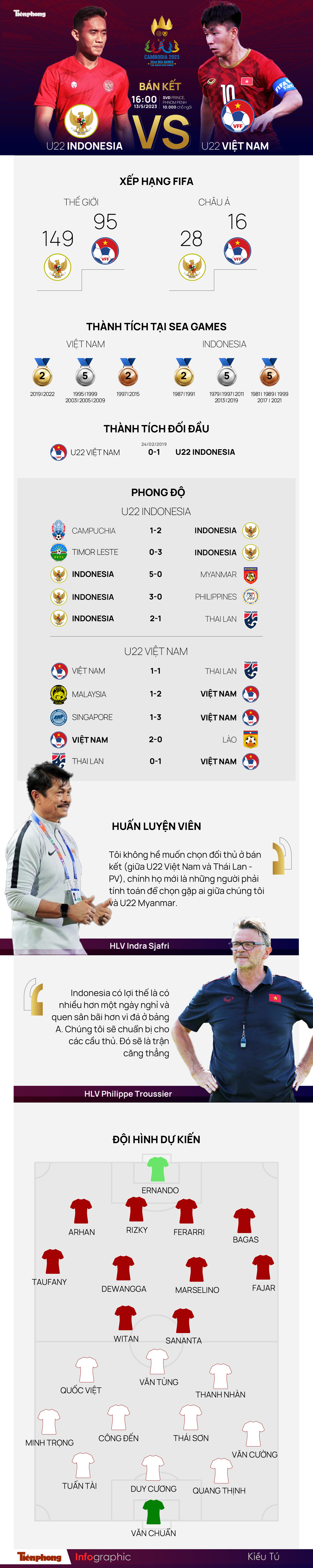 Vấn đề quan trọng nhất là xét cả thực lực lẫn phong độ thời điểm hiện tại, U22 Indonesia đều cho thấy sẽ là đối thủ rất đáng gờm đối với U22 Việt Nam. Dù vắng ngôi sao Ronaldo Kwateh trên hàng công và trung vệ Elkan Baggott, U22 Indonesia vẫn dự SEA Games 32 với lực lượng rất có chiều sâu. Khá nhiều trong số này từng tham dự SEA Games 31 ở Việt Nam năm ngoái như Ernando Ari, trung vệ Rizky Ridho, các tiền vệ Marselino Ferdinan hay đặc biệt là Witan Sulaeman…Quân số của U22 Indonesia quá nửa đang đá ở giải VĐQG nước này, xét về tổng thể giàu kinh nghiệm chiến đấu hơn so với U22 Việt Nam.