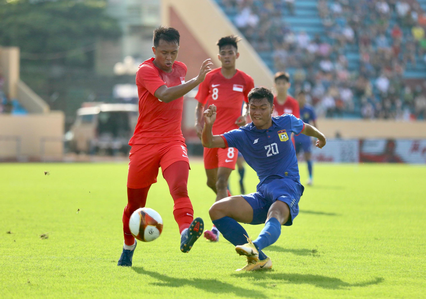 Chiều nay, trước sự cổ vũ của hơn 1 vạn CĐV tại sân Thiên Trường, các cầu thủ Lào đã thi đấu đầy ấn tượng trước U23 Singapore. Nhận thấy thực lực có chút yếu hơn nên Lào chủ trương chơi thấp. Cộng với lối đá đơn điệu, chỉ có thể điều bóng ra biên phải rồi tạt vào, U23 Singapore đã không thể nào gây ra khó khăn cho hàng thủ đối phương.