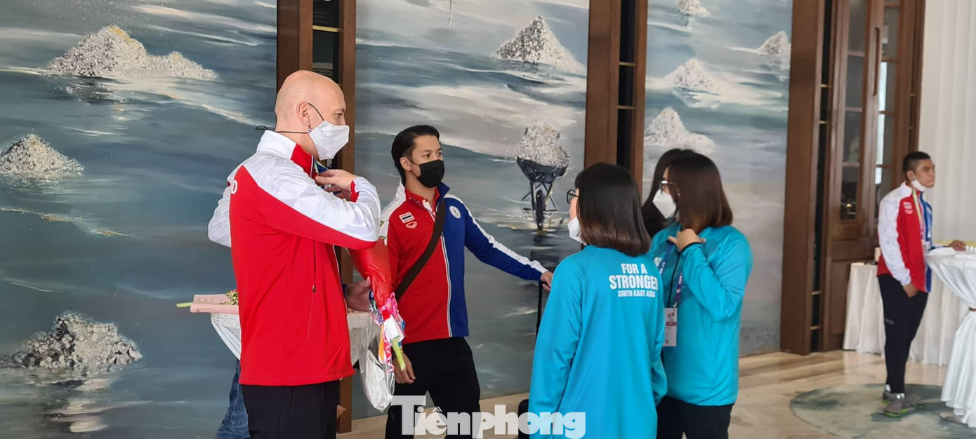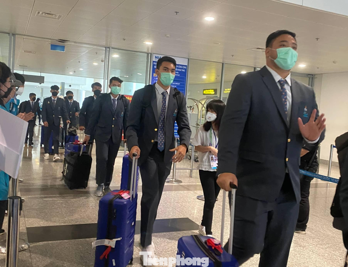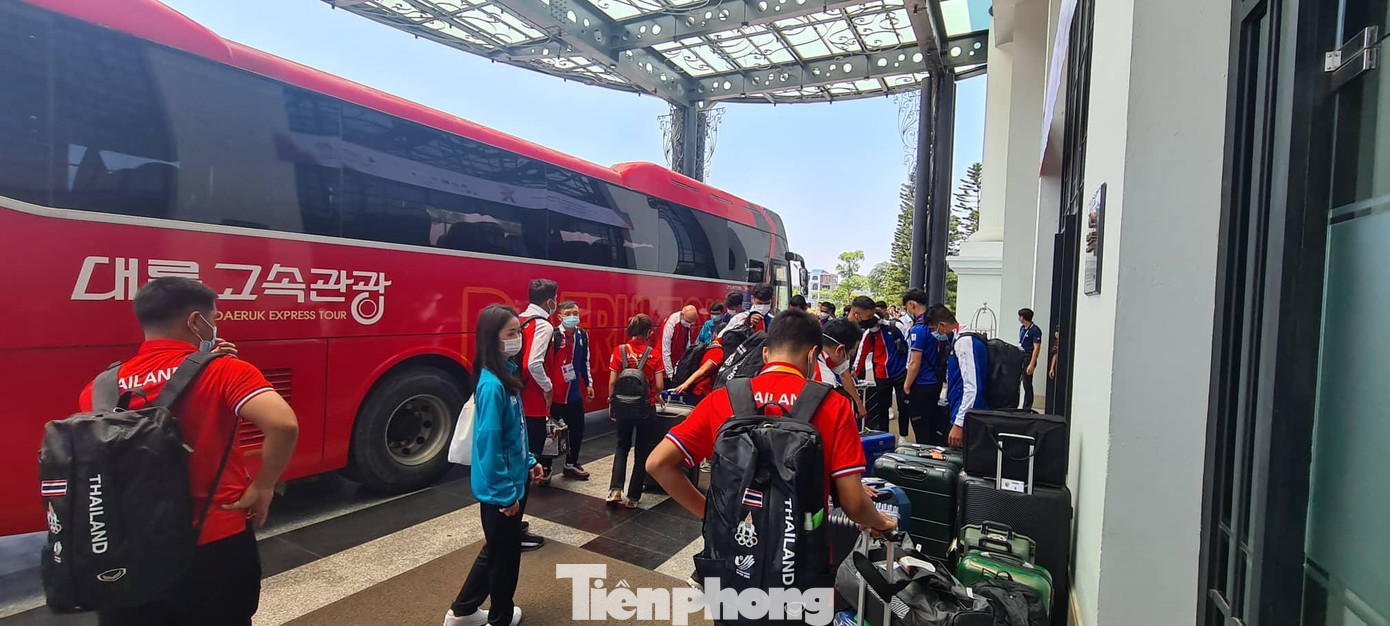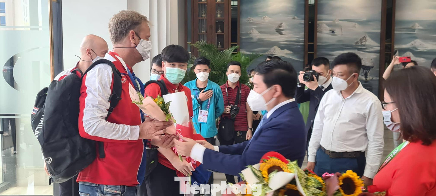 | Lúc 9 giờ 35 sáng nay, 4/5, đội bóng đá Nam Thái Lan có mặt tại sân bay Nội Bài để thi đấu SEA Games 31 - Ảnh: Hoàng Long  | | Lúc hơn 12 giờ trưa 4/5, đoàn Thái Lan có mặt tại khách sạn Nam Cường tại thành phố Nam Định và được lãnh đạo tỉnh Nam Định đón tiếp nồng nhiệt - Ảnh: Hoàng Long | |