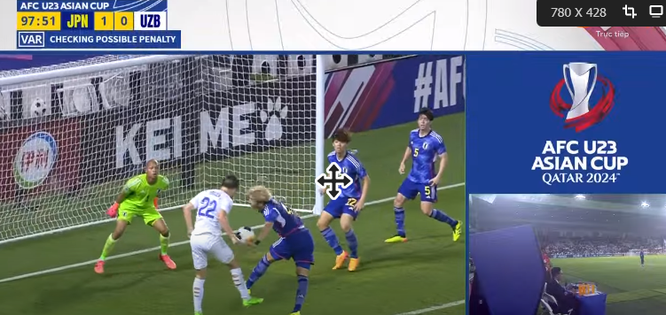 90'+5: Hậu vệ Nhật Bản để bóng chạm tay trong vòng cấm. VAR can thiệp và penalty cho Uzbekistan.