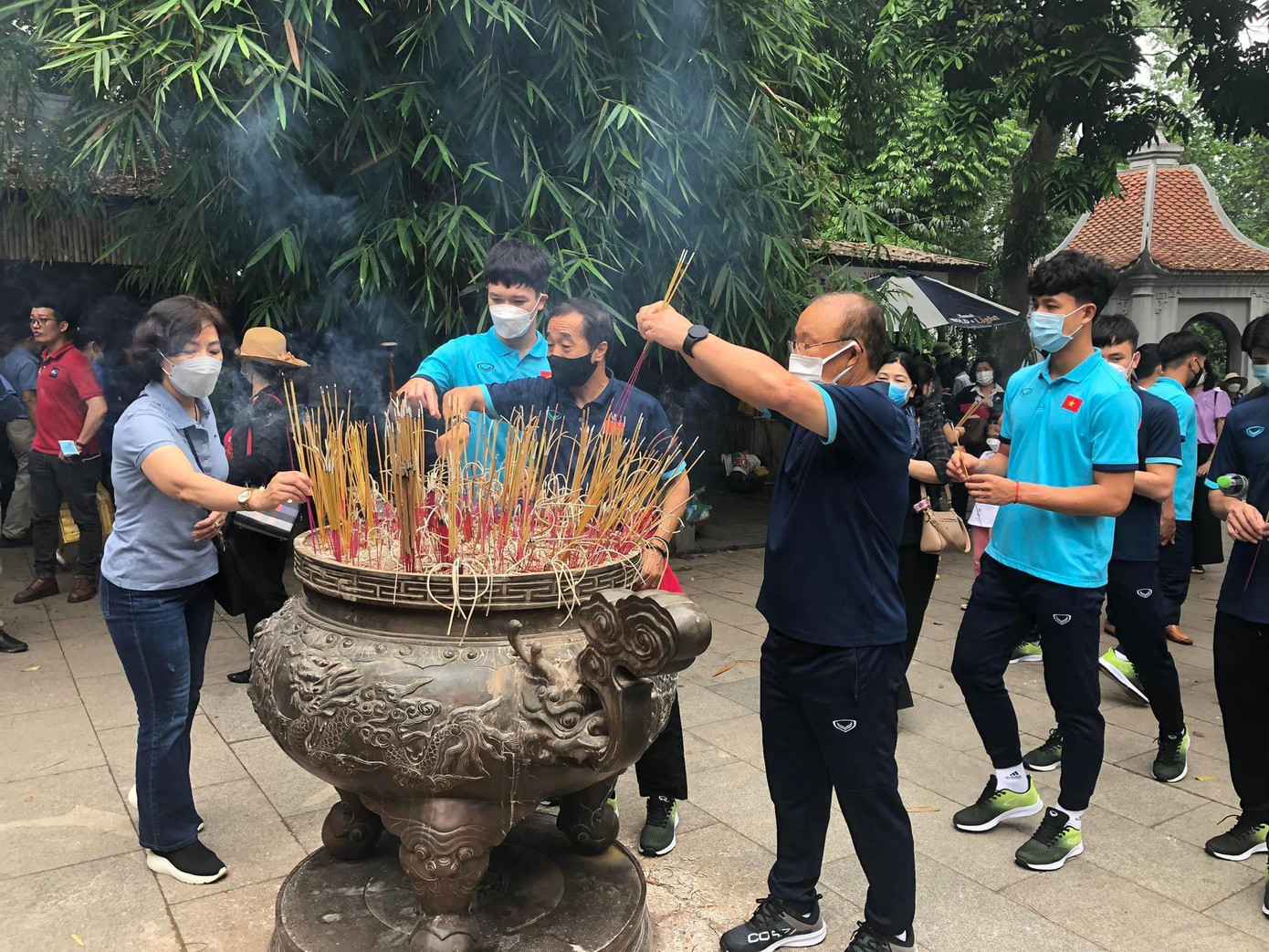 Sau lễ dâng hương, U23 Việt Nam trở về khách sạn cách đó 4 km và sẽ có buổi tập đầu tiên trên sân Việt Trì vào chiều hôm nay.