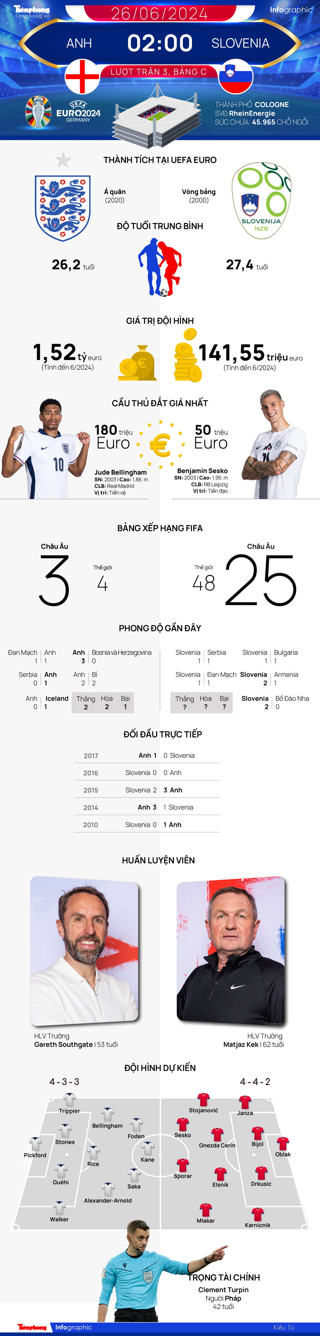 TPO - Tuyển Anh có trận đối đầu với Slovenia trong khuôn khổ lượt cuối vòng bảng EURO 2024 sẽ diễn ra vào lúc 2 giờ ngày 26/6. Ở trận này, tuyển Anh chỉ cần một kết quả hòa là họ có thể đi tiếp. Nhưng với niềm kiêu hãnh của một đội bóng “toàn sao là sao”, Harry Kane và đồng đội có quyết tâm giành trọn 3 điểm để chắc ngôi đầu bảng?