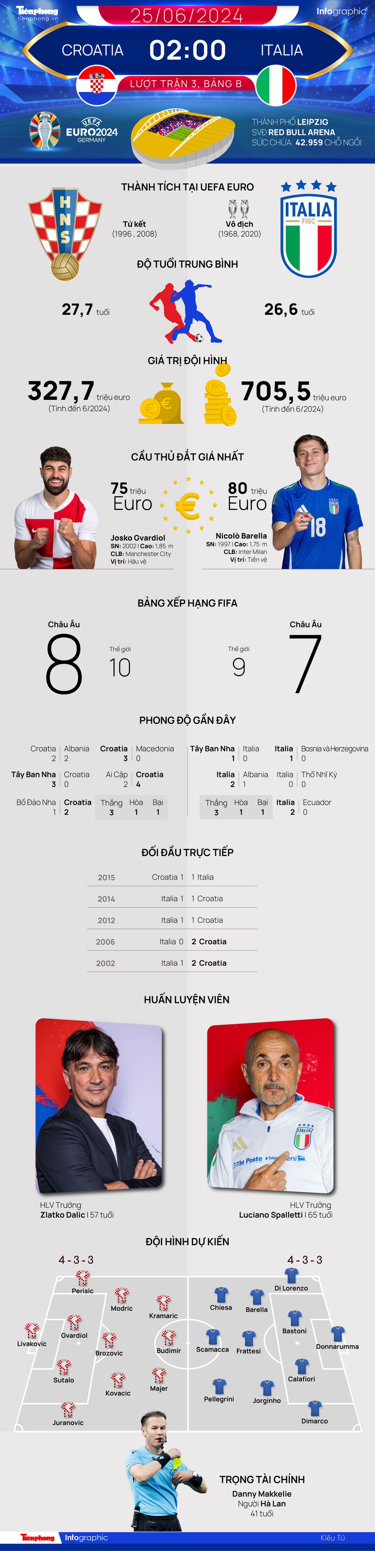 TPO - Tại bảng B EURO 2024, Tây Ban Nha đã chắc ngôi đầu ở bảng sau hai trận toàn thắng. Trận cầu giữa Croatia và Italia lúc 2 giờ ngày 25/06 sẽ là cuộc đấu giành ngôi nhì bảng. Croatia đang ở thế chân tường, Modric và đồng đội buộc phải có 3 điểm trước Italia mới có cơ hội lọt vào vòng 1/8.