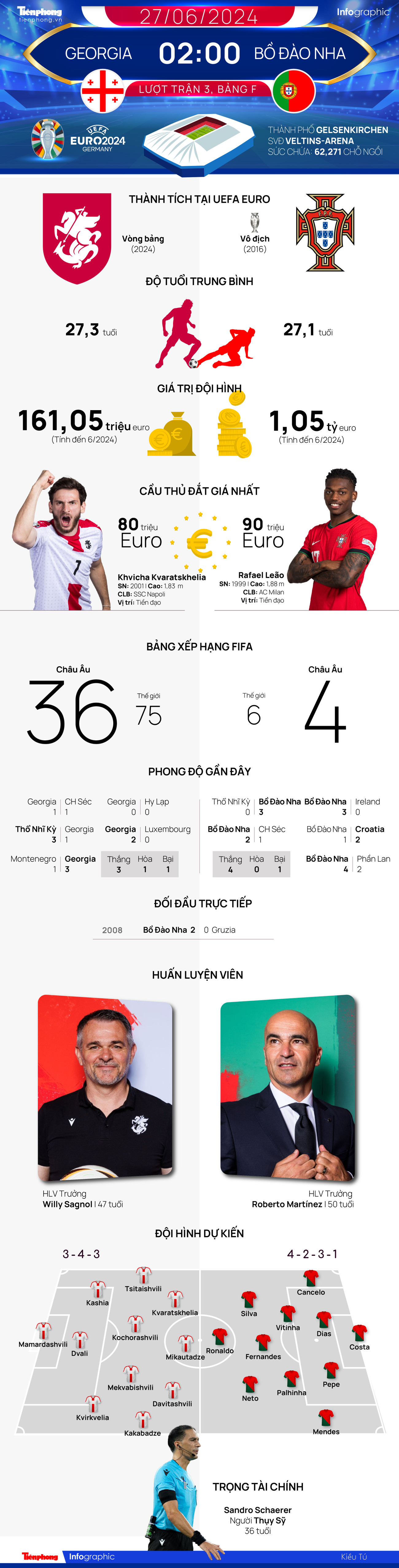 TPO - Bồ Đào Nha gặp Georgia trong khuôn khổ lượt cuối vòng bảng EURO 2024, diễn ra lúc 2 giờ ngày 27/6. Ronaldo cùng đồng đội đã có vé đi tiếp và chỉ cần một điểm họ sẽ chắc ngôi đầu bảng. Phía bên kia, Georgia không còn con đường nào khác ngoài chiến đấu hết mình, cộng với mong chờ một điều thần kỳ nào đó xuất hiện.