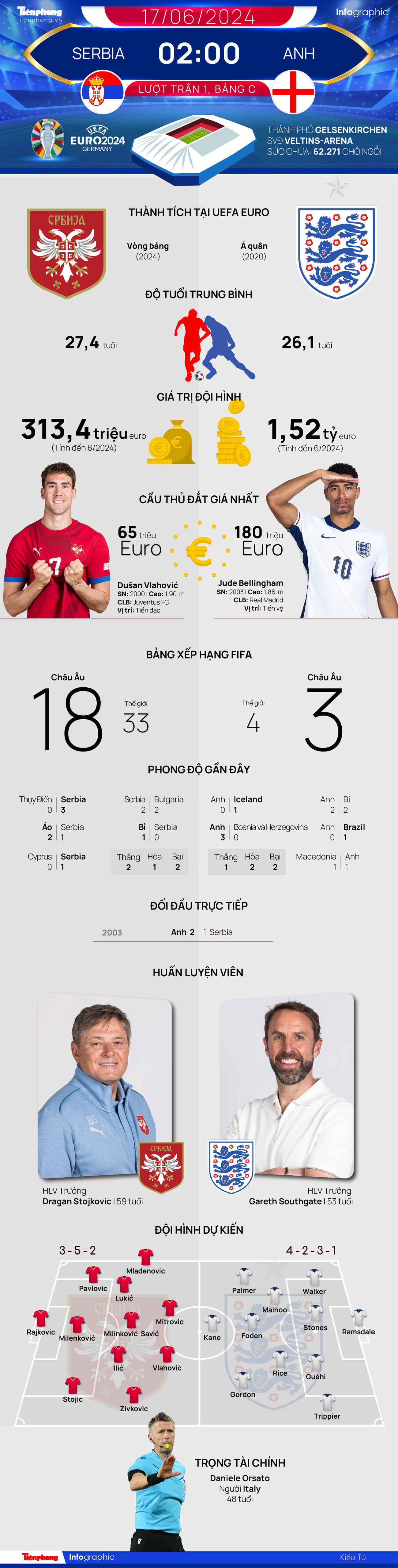 TPO - Tuyển Anh sẽ gặp Serbia trong khuôn khổ bảng C EURO 2024 diễn ra vào lúc 2h00 ngày 17/6 trên SVĐ Veltins, thành phố Gelsenkirchen. Á quân EURO 2020 vượt trội đối thủ non trẻ lần đầu tham dự VcK EURO. Serbia có cơ hội nào để có điểm trước Tam sư?