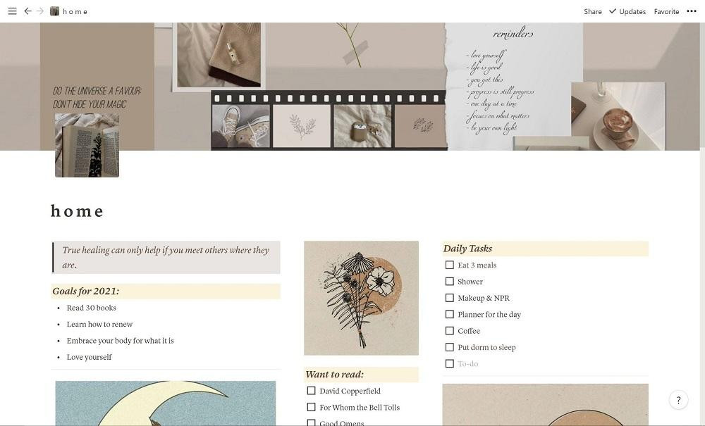 Trong khoảng ba năm trở lại đây, ứng dụng ghi chú Notion làm mưa làm gió trong cộng đồng giới trẻ trong việc quản lý và sắp xếp cuộc sống. Bạn có thể thực hiện tất cả các nhu cầu như viết blog, nhật ký, viết luận, ghi chú nội dung môn học hoặc bất kỳ một nội dung nào khác. Lên kế hoạch theo ngày, theo tháng, theo năm với lịch, deadline và nhắc nhở đi kèm. Quản lý dự án, chi tiêu, sở thích và có thể theo dõi tiến độ của từng việc. Lập các danh sách cá nhân như các website hữu ích; sách đã, đang và sẽ đọc; phim đã, đang và sẽ xem.