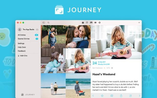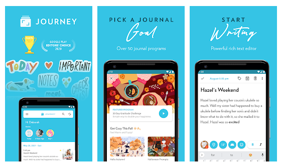 Là một trong những ứng dụng viết nhật ký trên điện thoại thành công nhất hiện nay, Journey được người dùng hay các biên tập viên của Google lựa chọn. Giao diện đẹp mắt và dễ nhìn. Ứng dụng có đếm số lượng từ trong bài viết và dễ dàng đính kèm hình ảnh. Bên cạnh đó, Journey còn có chức năng tự động thêm thông tin thời tiết hằng ngày. Hiển thị dưới dạng bản đồ những nơi đã đi qua với cơ sở dữ liệu các địa danh. Sử dụng thẻ tag và từ khóa tìm kiếm.