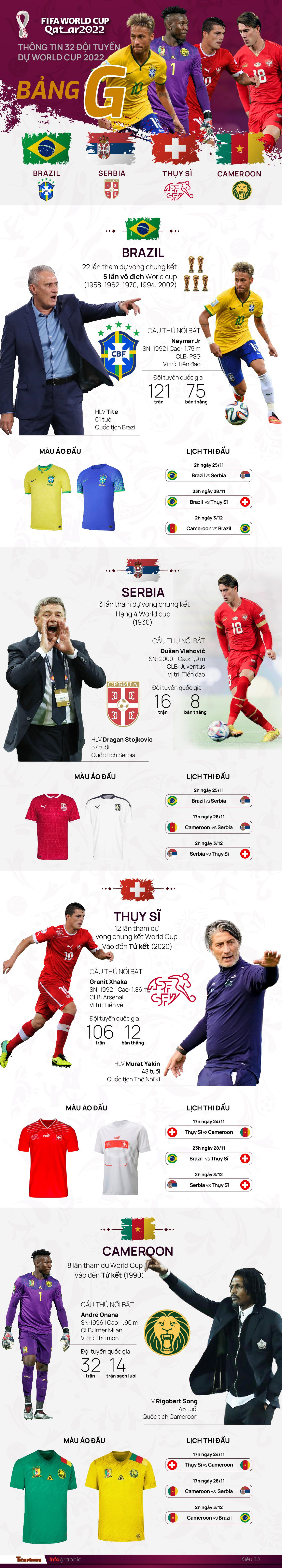 Tại World Cup 2022, Brazil rơi vào bảng tử thần với Thụy Sĩ, Serbia và Cameroon. Đây là bảng đấu khó lường nhất tại Qatar, bởi lẽ Thụy Sĩ và Serbia đều mạnh hơn danh tiếng vốn có. Ở vòng loại, Thụy Sĩ khiến Italia ôm hận, trong khi Serbia đứng trên cả Bồ Đào Nha. Trong khi đó, Cameroon cũng là đội tuyển thú vị đến từ châu Phi.