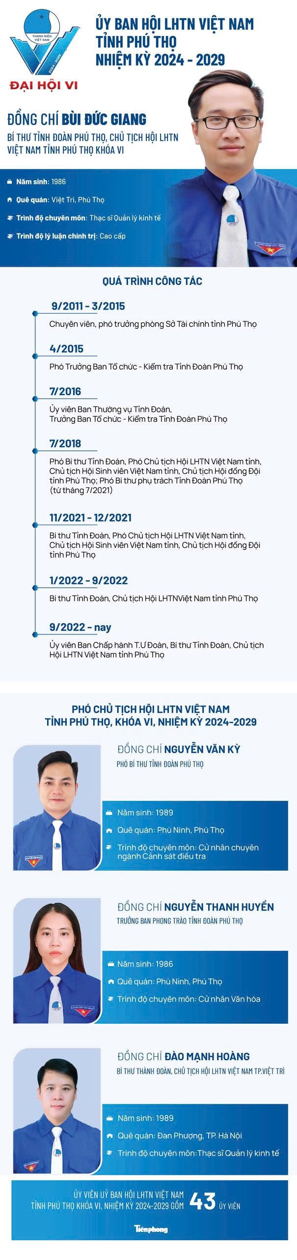TPO - Đại hội đại biểu Hội LHTN Việt Nam tỉnh Phú Thọ lần thứ VI, nhiệm kỳ 2024 - 2029 đã hiệp thương chọn cử 43 anh, chị tham gia Ủy ban Hội LHTN Việt Nam tỉnh Phú Thọ, nhiệm kỳ 2024 - 2029. Anh Bùi Đức Giang - Bí thư Tỉnh Đoàn, Chủ tịch Hội LHTN Việt Nam tỉnh Phú Thọ khóa V, tiếp tục được tín nhiệm làm Chủ tịch Hội LHTN Việt Nam tỉnh Phú Thọ khóa VI. Các Phó Chủ tịch Hội LHTN Việt Nam tỉnh Phú Thọ khóa VI, gồm anh Nguyễn Văn Kỳ, chị Nguyễn Thanh Huyền, anh Đào Mạnh Hoàng.