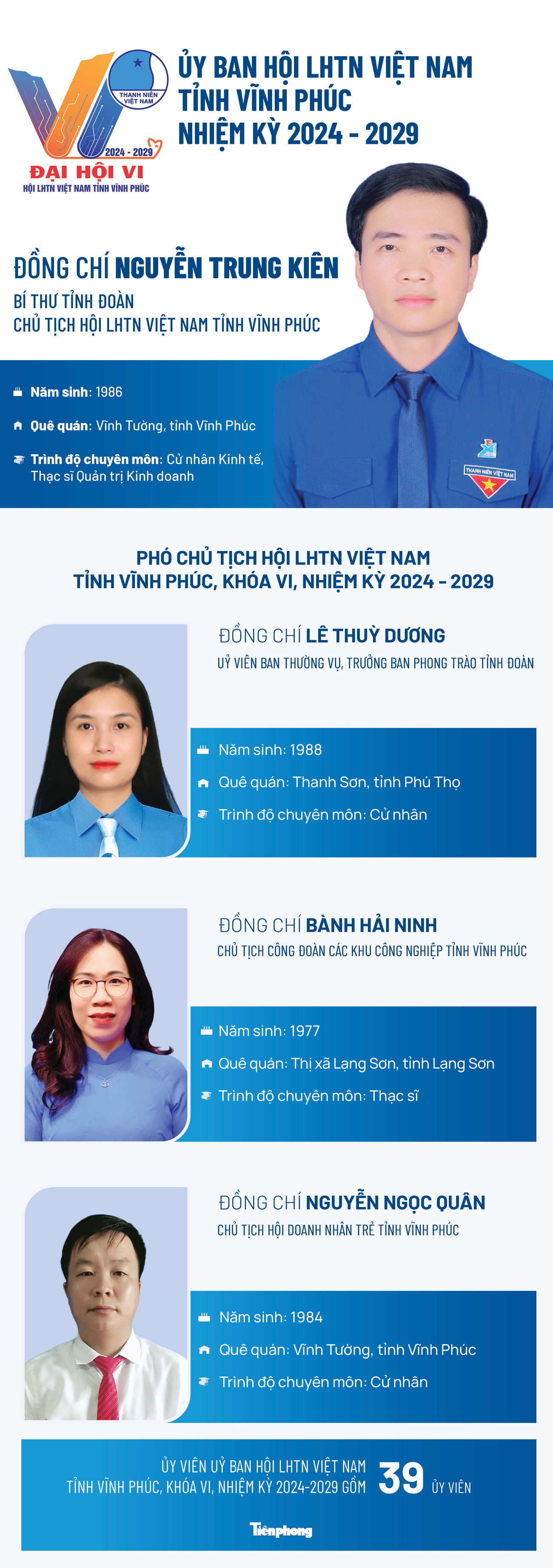 TPO - Đại hội đại biểu Hội LHTN Việt Nam tỉnh Vĩnh Phúc lần thứ VI, nhiệm kỳ 2024 - 2029 đã hiệp thương chọn cử 39 anh, chị tham gia Uỷ ban Hội LHTN Việt Nam tỉnh Vĩnh Phúc, nhiệm kỳ 2024 - 2029. Anh Nguyễn Trung Kiên – Bí thư Tỉnh Đoàn, Chủ tịch Hội LHTN Việt Nam tỉnh Vĩnh Phúc khoá V, tiếp tục được tín nhiệm làm Chủ tịch Hội LHTN Việt Nam tỉnh Vĩnh Phúc khóa VI.