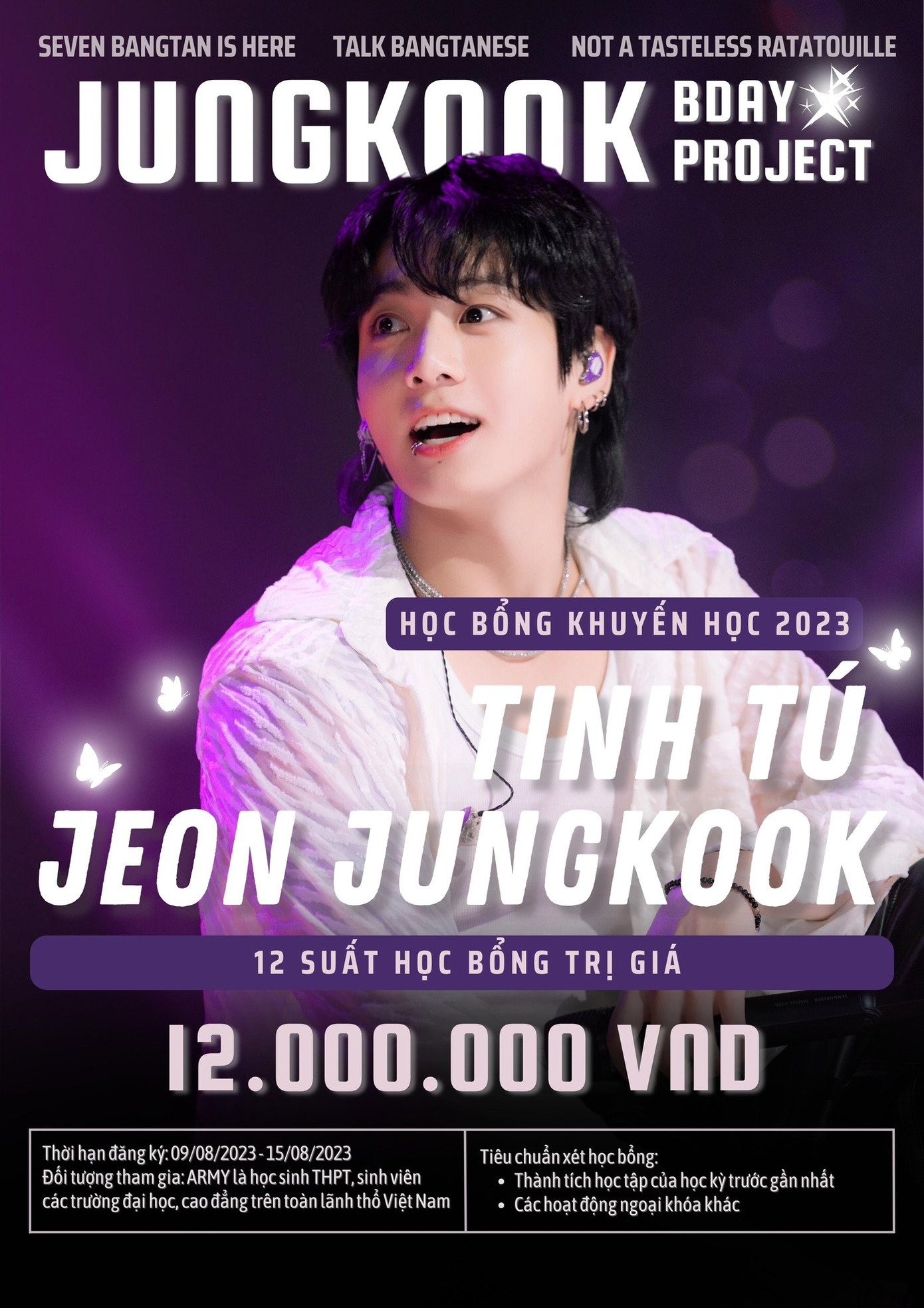 Dự án Học bổng Khuyến học "Tinh Tú Jeon Jung Kook - 2023" chính thức khai pháo vào ngày 7/8 và kết thúc, công bố bảng vàng 12 cái tên xuất sắc nhất sau thời gian lọc hồ sơ vào đúng ngày sinh nhật của Jung Kook (1/9).