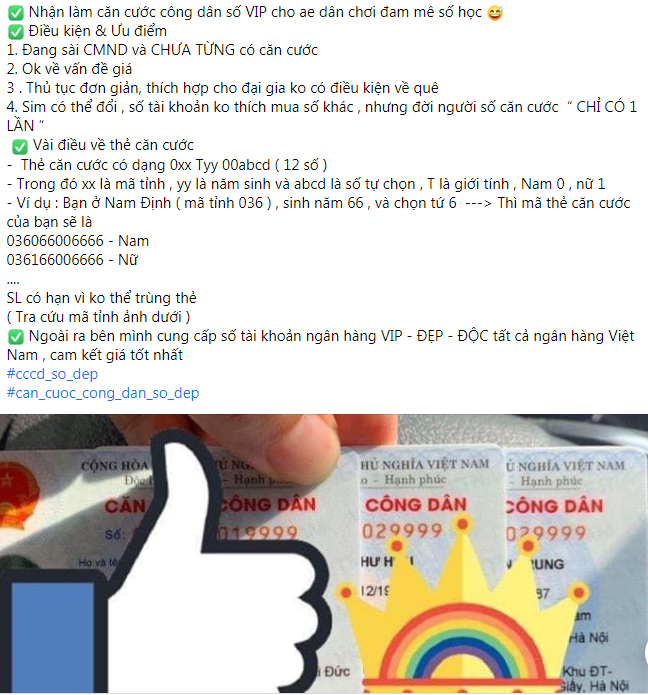 Lợi dụng tâm lý này, các đối tượng đăng tải thông tin trên mạng xã hội nhận làm dịch vụ CCCD gắn chip số đẹp công khai với các bước đơn giản như: Cung cấp địa chỉ quê quán trên CMND, họ và tên, quê quán. Sau đó bên nhận làm dịch vụ sẽ tra số và gửi số đẹp để khách hàng chọn lựa. Sau khi chọn được số đẹp, khách hàng chuyển khoản và nhận được lịch hẹn lên lăn tay.