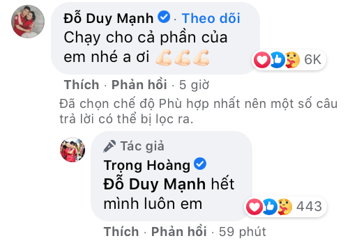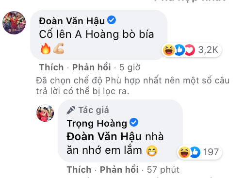 Theo đó, cầu thủ Duy Mạnh, người vừa nhận 2 thẻ vàng trong trận đấu trước đó và không thể tiếp tục ra sân đã nhắn nhủ đàn anh: "Chạy cho cả phần của em nhé anh ơi". Bên cạnh đó, Đoàn Văn Hậu vì đang điều trị chấn thương nên phải tạm vắng mặt, cũng đã khích lệ tinh thần Trọng Hoàng: “Cố lên anh Hoàng bò bía”. Những dòng bình luận tuy không dài nhưng cũng đủ để thể hiện tình cảm gắn bó của các thành viên đội tuyển Việt Nam với nhau.