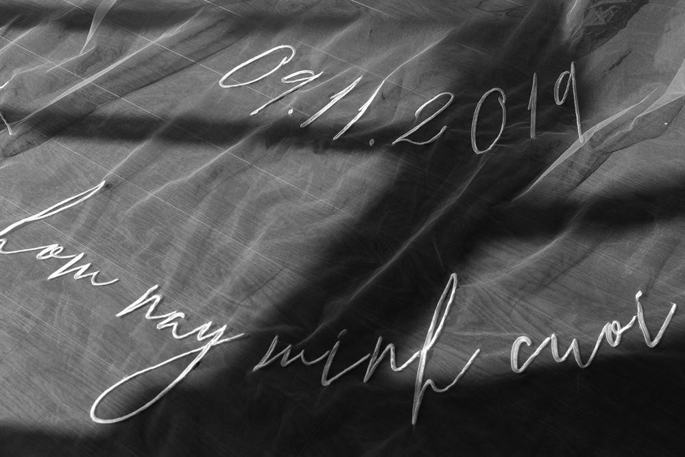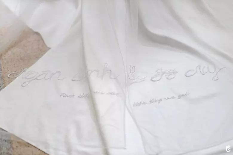 Đặc biệt nhất là chiếc khăn voan mà Ngân Anh đội có thêu tên cô dâu chú rể cùng dòng chữ tiếng Anh First time we met - Right things we get (Lần đầu ta gặp nhau - Điều đúng đắn ta có được) như muốn khẳng định cặp đôi đã gặp đúng người, đúng thời điểm.