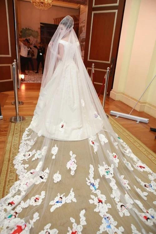 Có lẽ cho đến bây giờ, chiếc khăn voan của Đông Nhi vẫn là thiết kế đặc biệt nhất, cầu kỳ nhất trong bộ sưu tập khăn voan của các cô dâu showbiz Việt.