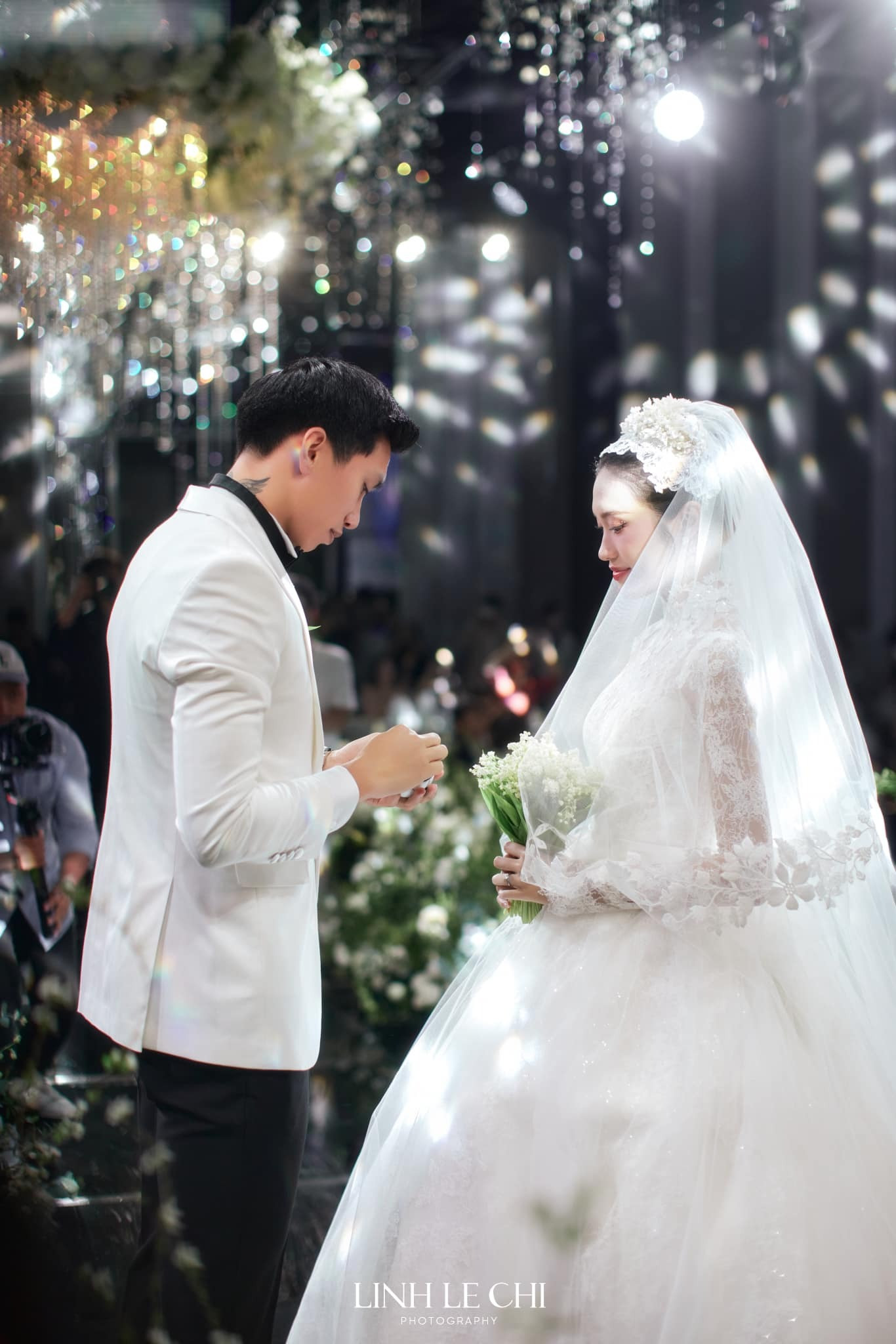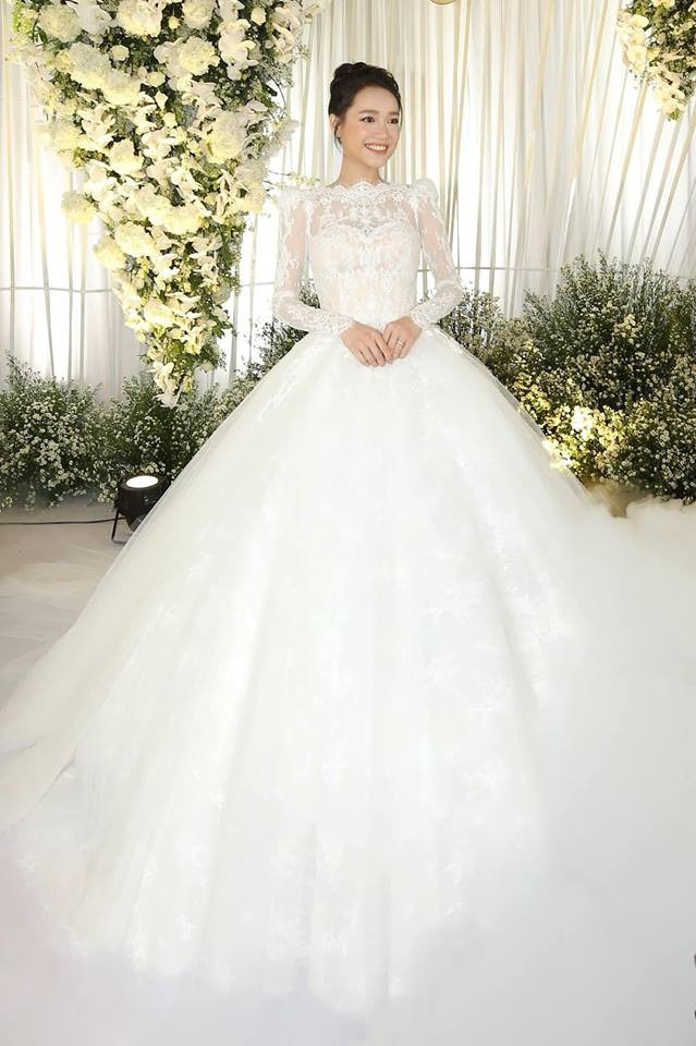 Như Nhã Phương đã có bộ váy như chị em sinh đôi với váy cưới của Hoa hậu Khánh Vân. Cùng là kiểu dáng thân xòe rộng hết cỡ, thắt eo và thân trên phủ ren giúp người mặc lộng lẫy như công chúa.