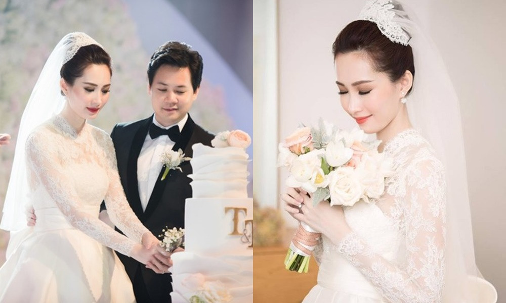 Tăng Thanh Hà cũng chọn một bộ váy ren thanh lịch, kín đáo mà vẫn đẹp rực rỡ khi làm lễ cưới với doanh nhân Louis Nguyễn trong nhà thờ. Váy cưới của Tăng Thanh Hà đến từ nhà mốt nổi tiếng Monique Lhuillier và có giá xấp xỉ 200 triệu đồng vào năm 2012.