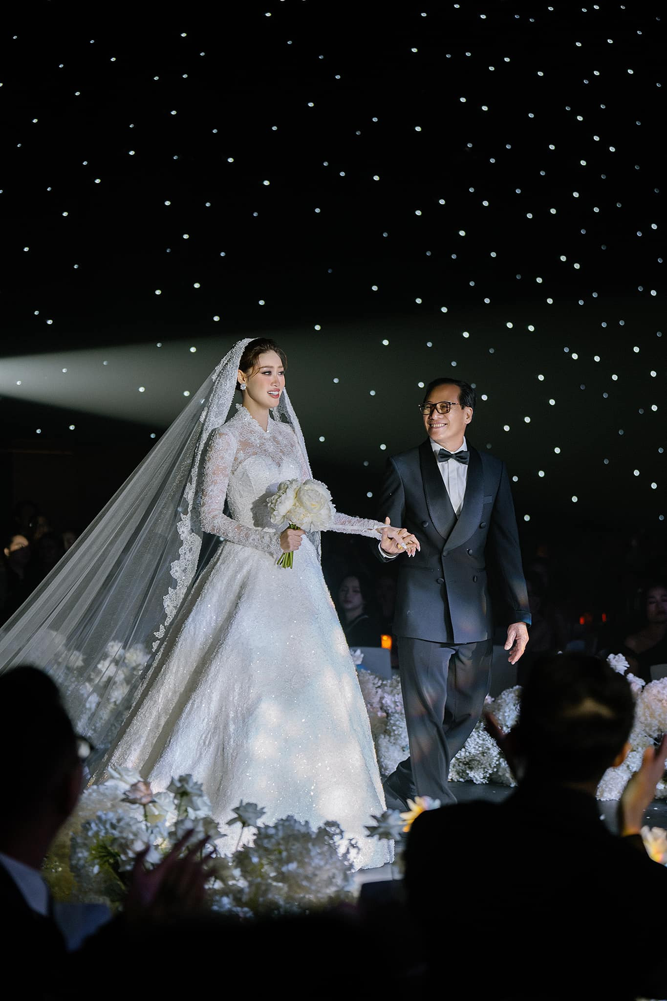 Hoa hậu Đặng Thu Thảo được khen ngợi hết lời khi bước lên lễ đường với bộ váy không cần đính kết cầu kỳ nhưng vẫn đủ tinh khôi và lộng lẫy như thế này.