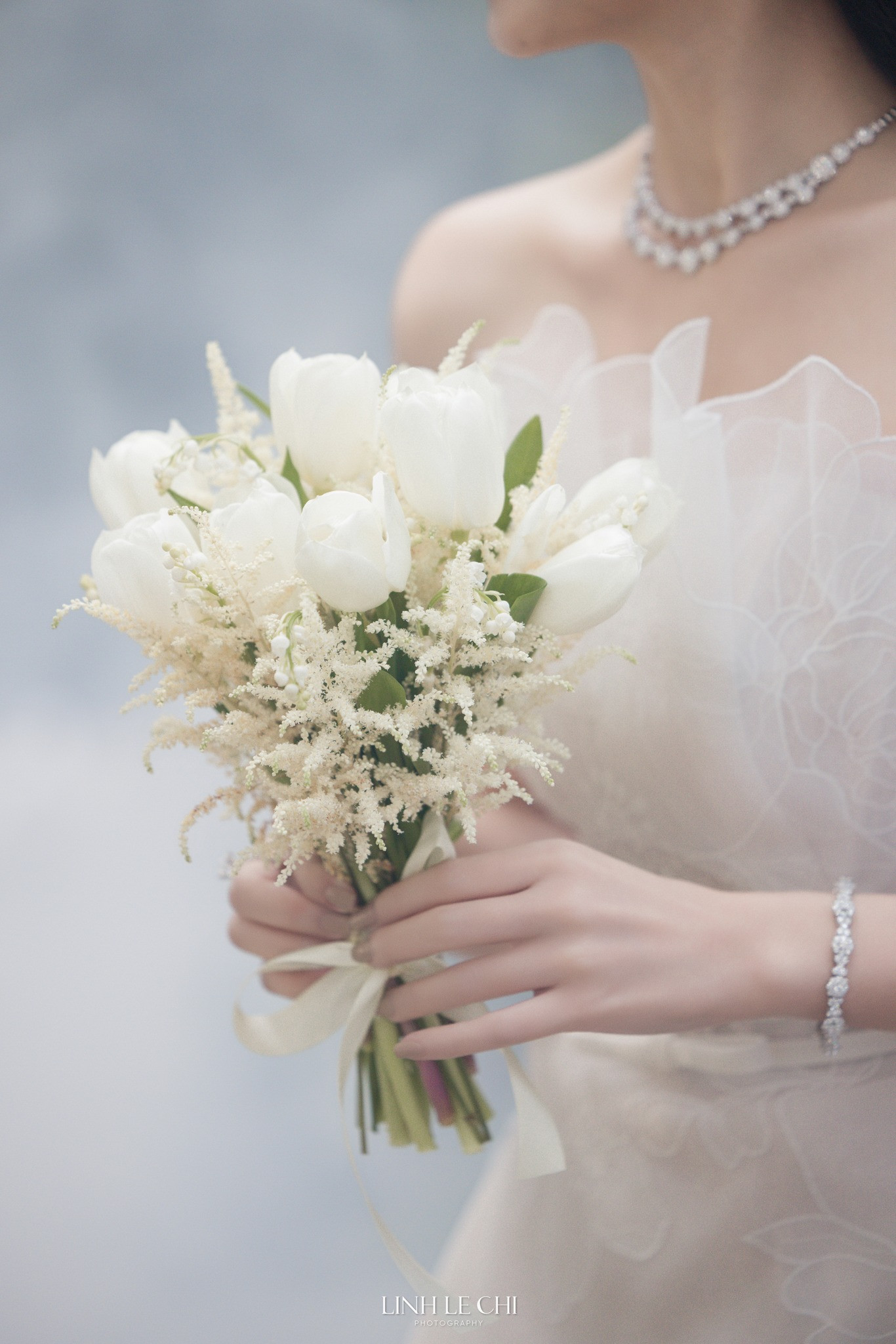 Dáng váy chữ A với phần eo thắt nơ xinh xắn đã tôn lên vòng eo nhỏ xíu của cô dâu. Đặc biệt nhất là phần ngực áo được đính những bông hoa calla lily dịu dàng kết từ vải voan, tạo thành điểm nhấn đẹp mắt cho bộ váy. Hoa calla lily hay còn gọi là hoa rum với màu trắng tinh khôi, tượng trưng cho tình yêu đậm sâu, thắm thiết, thủy chung mãi mãi trước sau không thay đổi.