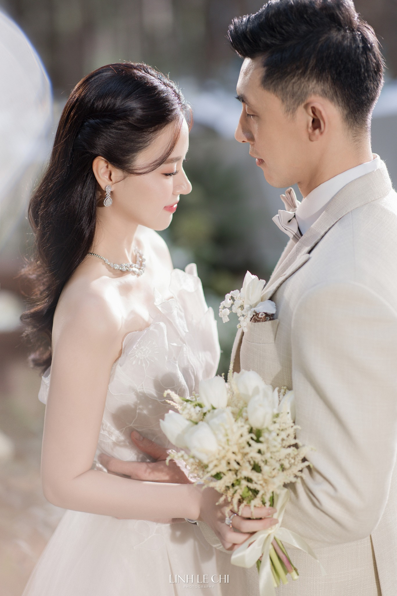 Hoặc khi chụp ảnh cưới cùng Quang Hải, Chu Thanh Huyền cũng mặc một bộ váy có phần ngực đính hoa kết từ vải voan, tương tự mẫu váy Midu mặc trong tiệc đính hôn.