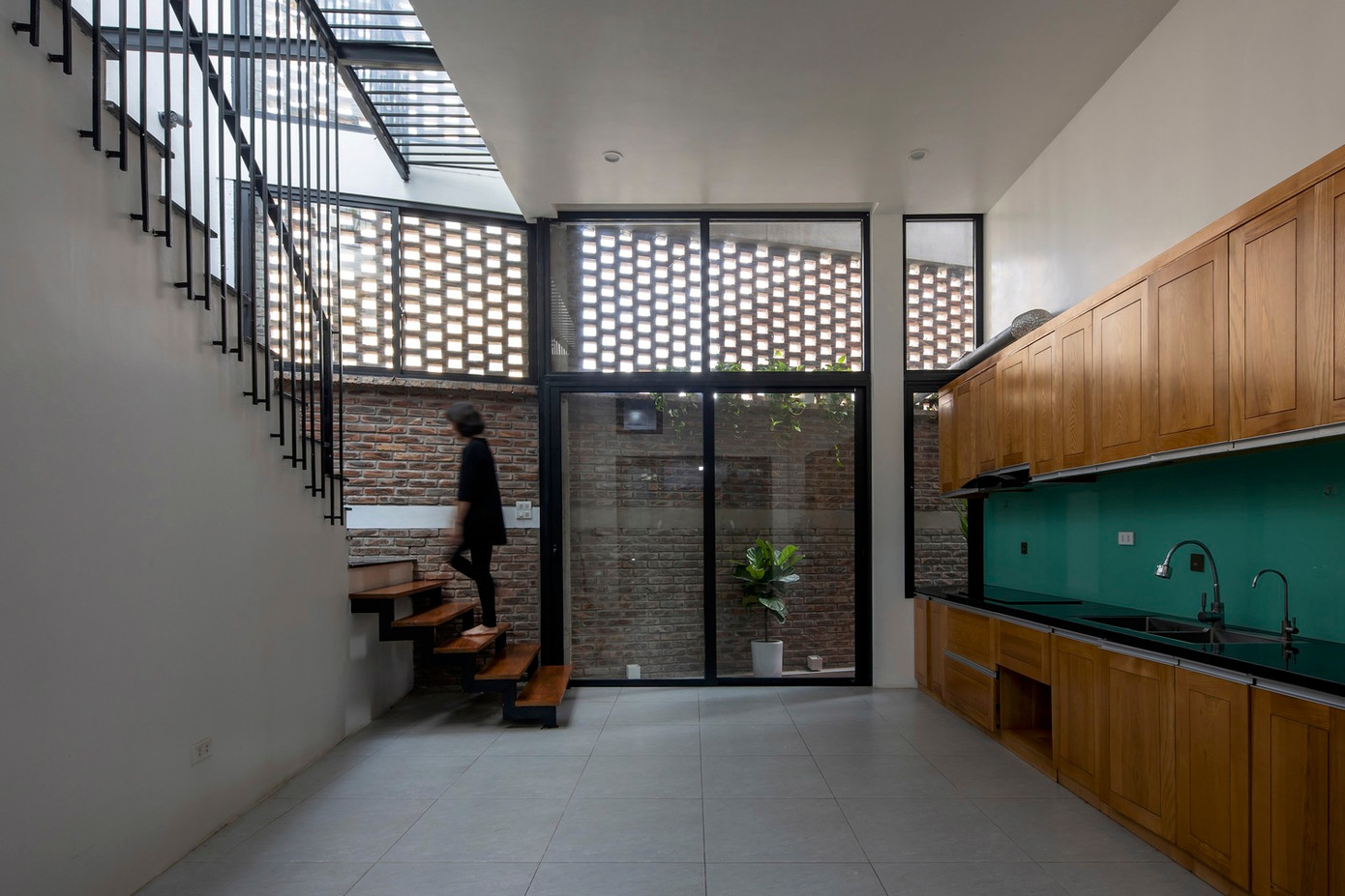 | Với mặt tiền của ngôi nhà hướng về phía Tây, KTS áp dụng lớp gạch thông gió bên ngoài và lớp bên trong là hệ thống kính khổ lớn để đảm bảo luồng không khí tự nhiên, giảm nhiệt và giảm tiếng ồn. |