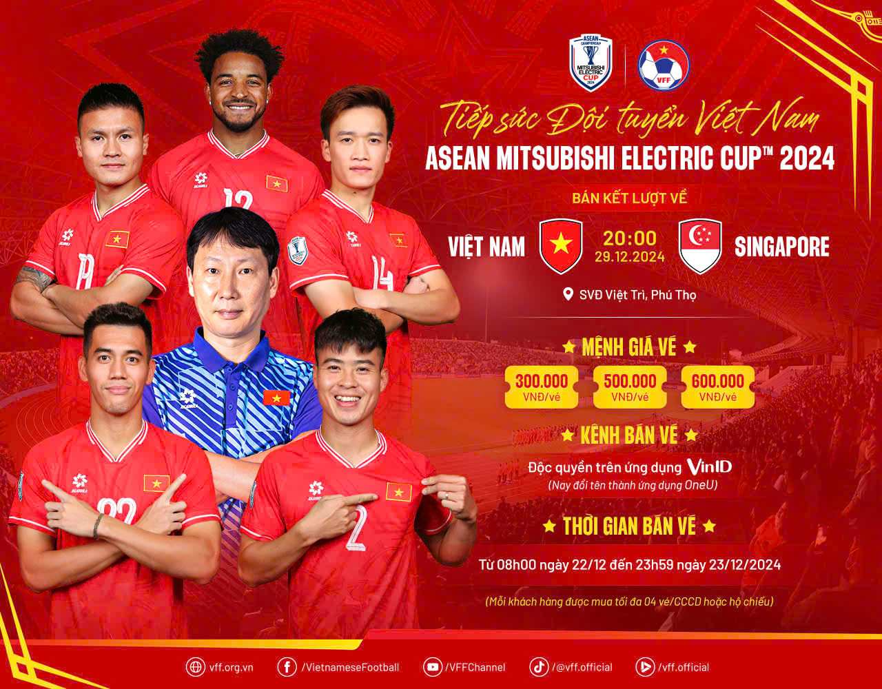 Sáng 22/12, Liên đoàn bóng đá Việt Nam (VFF) bắt đầu mở bán vé xem trận bán kết lượt về ASEAN Cup 2024 giữa đội tuyển Việt Nam và Singapore từ lúc 8h trên ứng dụng OneU.