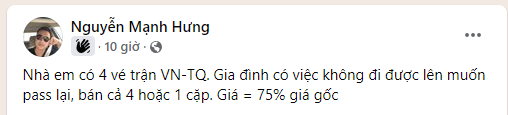 Trên thị trường chợ đen, chưa có tình trạng giá vé giảm sâu đến 50% như trận Việt Nam gặp Nhật Bản và Saudi Arabia trong năm 2021. VFF mở bán trực tiếp đồng nghĩa với việc lượng vé mà người hâm mộ và 'phe vé' không có nhiều. Theo ghi nhận của Tiền Phong, phần lớn số vé được rao bán với giá gốc hoặc rẻ hơn 20%.
