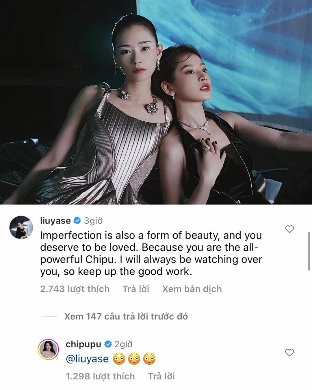 Dưới lời nhắn tình cảm của Lưu Nhã Sắt, Chi Pu để lại ba biểu tượng khuôn mặt mở to mắt đầy vẻ ngạc nhiên. Khán giả đoán rằng Chi Pu dùng icon này vì bình thường, Lưu Nhã Sắt luôn viết tiếng Trung chứ không dùng tiếng Anh. Chắc hẳn vì bài đăng của Chi Pu là tiếng Anh nên “cạ cứng” của cô ở Đạp Gió 2023 mới cần mẫn dịch những gì muốn nói sang tiếng Anh.