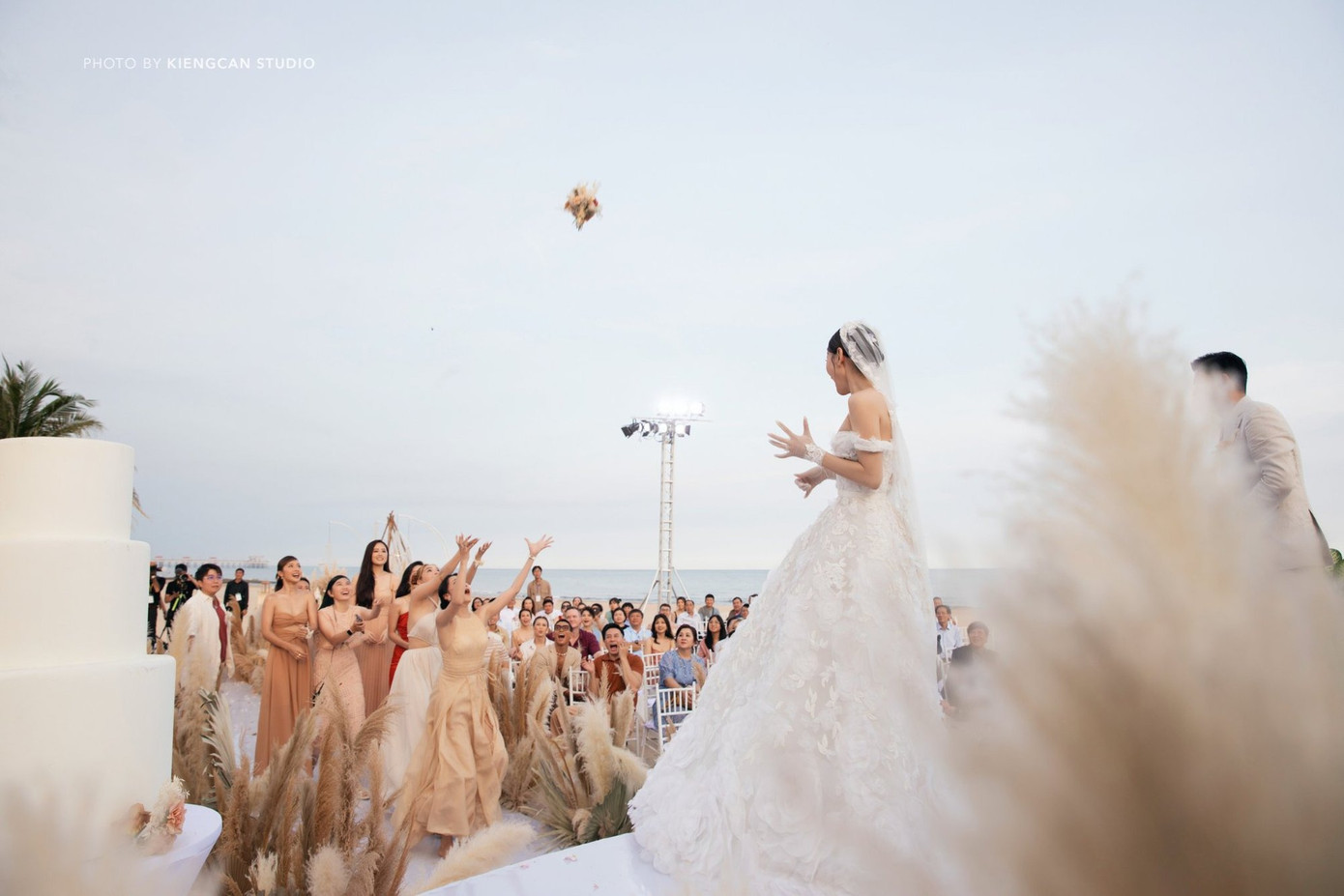 Màn tung hoa cuối tiệc cưới là một tiết mục được nhiều khách mời mong chờ. Cô dâu sẽ đứng quay lưng về phía các cô gái chưa kết hôn, tung bó hoa cưới về phía sau. Cô gái nào bắt được bó hoa sẽ gặp nhiều may mắn trong tình yêu.