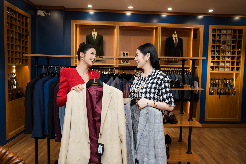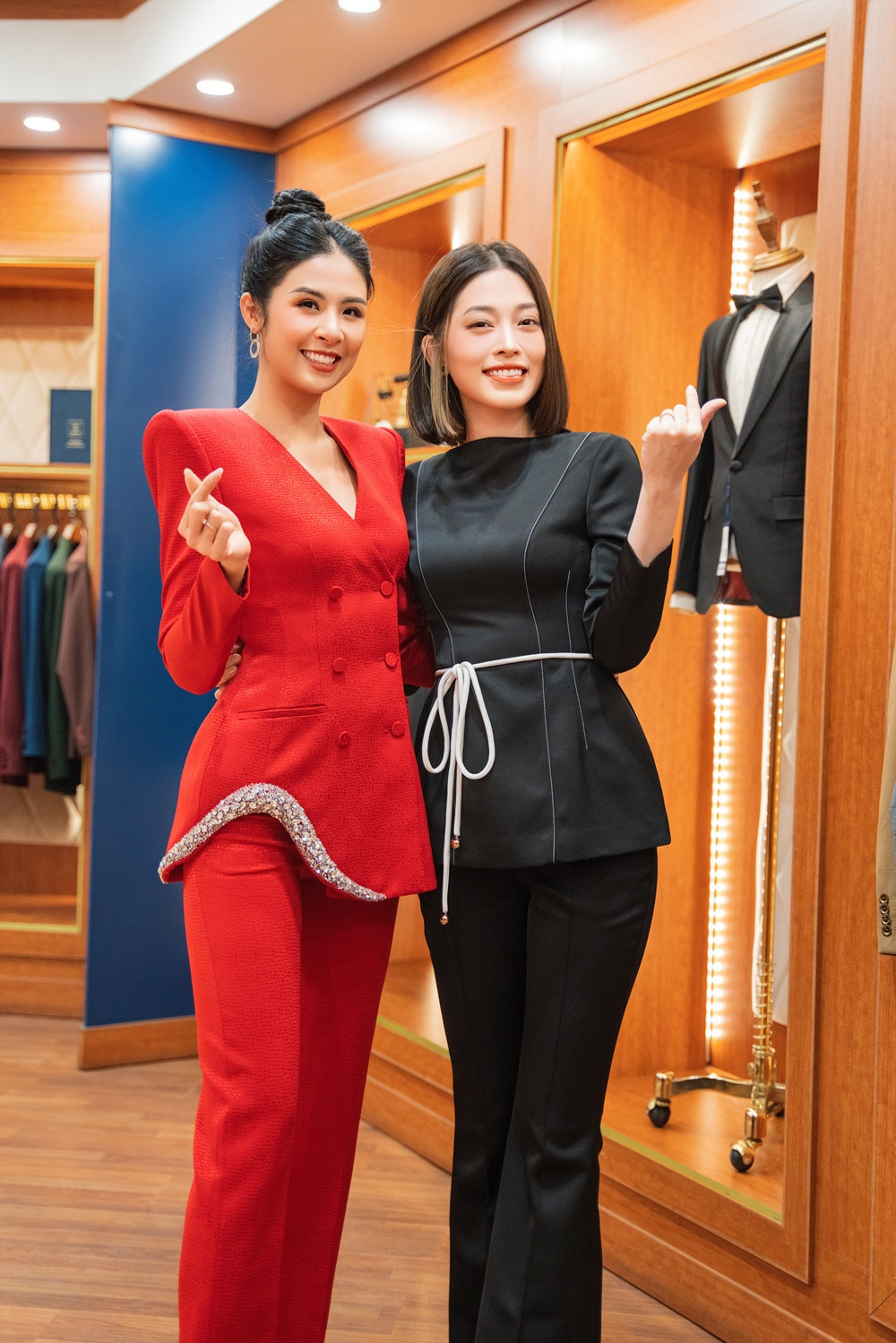 Mới đây, Ngọc Hân tổ chức sự kiện khai trương showroom mới tại TP HCM cho thương hiệu đồ vét nam mà cô góp vốn kinh doanh cùng em trai suốt 7 năm qua. Cô thay nhiều bộ trang phục thanh lịch để đón tiếp các vị khách mời trong suốt ngày dài khai trương. Nếu bộ suit đỏ cách điệu với chi tiết độn vai giúp hoa hậu toát lên sự quyền lực của “bà chủ” thương hiệu thì thiết kế áo thun lệch vai mix chân váy da xẻ cao quá đùi lại khiến Ngọc Hân trẻ trung, thanh lịch hơn.