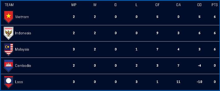 Do lúc này, có tới 3 đội nắm trong tay 6 điểm nên phải tính đối đầu giữa cả 3. Trong đó, Việt Nam có 3 điểm sau trận thắng Malaysia 3-0, Indonesia chưa gặp Việt Nam cũng như Malaysia nên thành tích đối đầu được tạm tính là 0 trận, 0 điểm, trong khi Malaysia một trận, 0 điểm và hiệu số bàn thắng bại là -3.