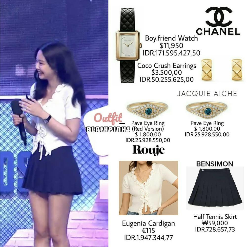 Jennie cũng chọn đồ hãng Rouje với chiếc áo cardigan dáng lửng có viền xếp bèo vô cùng dịu dàng. Jennie đã nhiều lần mặc thiết kế tương tự như thế này chứng tỏ cô nàng rất thích cardigan lửng ngang eo.