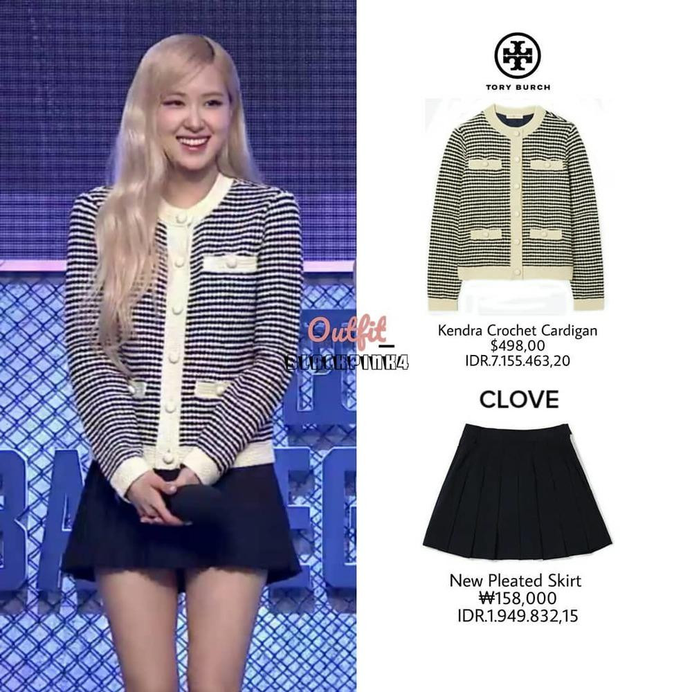 Rosé chọn một mẫu áo cardigan kẻ trắng đen trẻ trung của thương hiệu Tory Burch với giá 498 đôla (khoảng 11,5 triệu đồng) cùng chân váy đen giá 3 triệu.