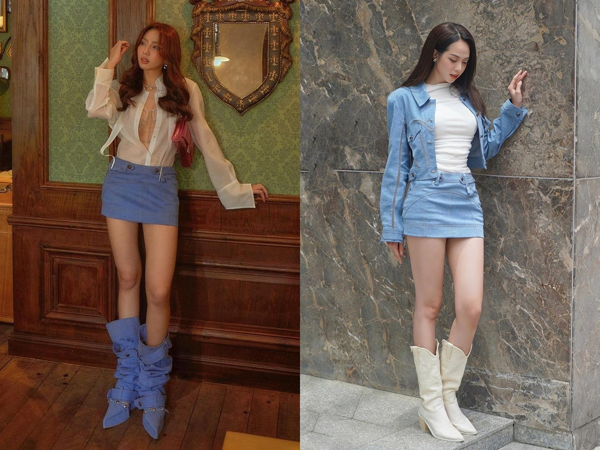 Cả Thanh Thủy lẫn Thùy Tiên đều rất thích váy siêu ngắn để lộ đôi chân thon dài, nên cũng rất dễ "đụng hàng" mẫu chân váy ngắn một gang tay này. Hoa hậu Thanh Thủy được khen là chọn boots phù hợp hơn, trong khi đôi boots của Thùy Tiên bị xem là kém tôn dáng, khiến đôi chân nàng hậu bớt thon gọn.