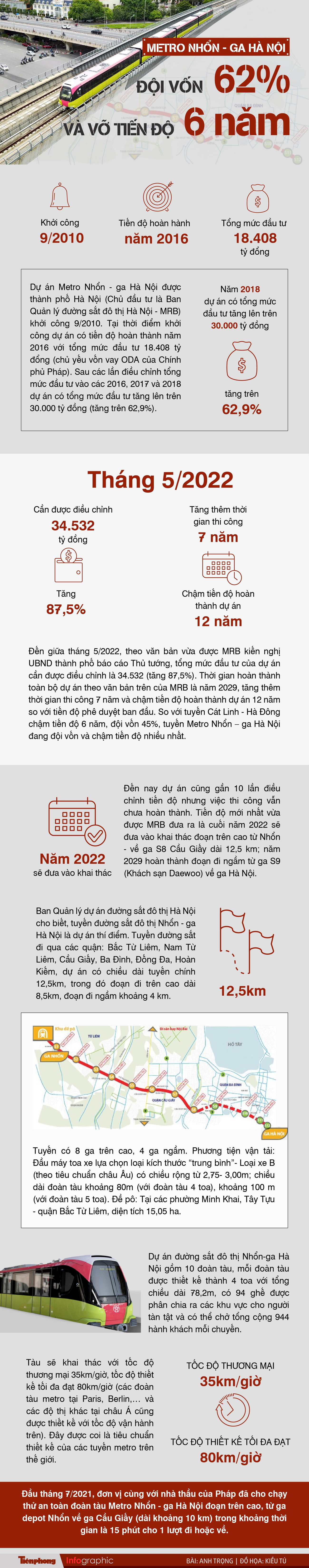 TPO - Có tiến độ hoàn thành năm 2016 với mục tiêu nâng cao năng lực vận tải công cộng, giảm xe cá nhân, giải quyết tình ùn tắc nhưng đến nay, dự án metro Nhổn - ga Hà Nội đã chậm tiến độ 6 năm. Trong tuần qua, dự án tiếp tục được đề nghị tăng vốn tiếp và kéo dài thi công thêm 7 năm.